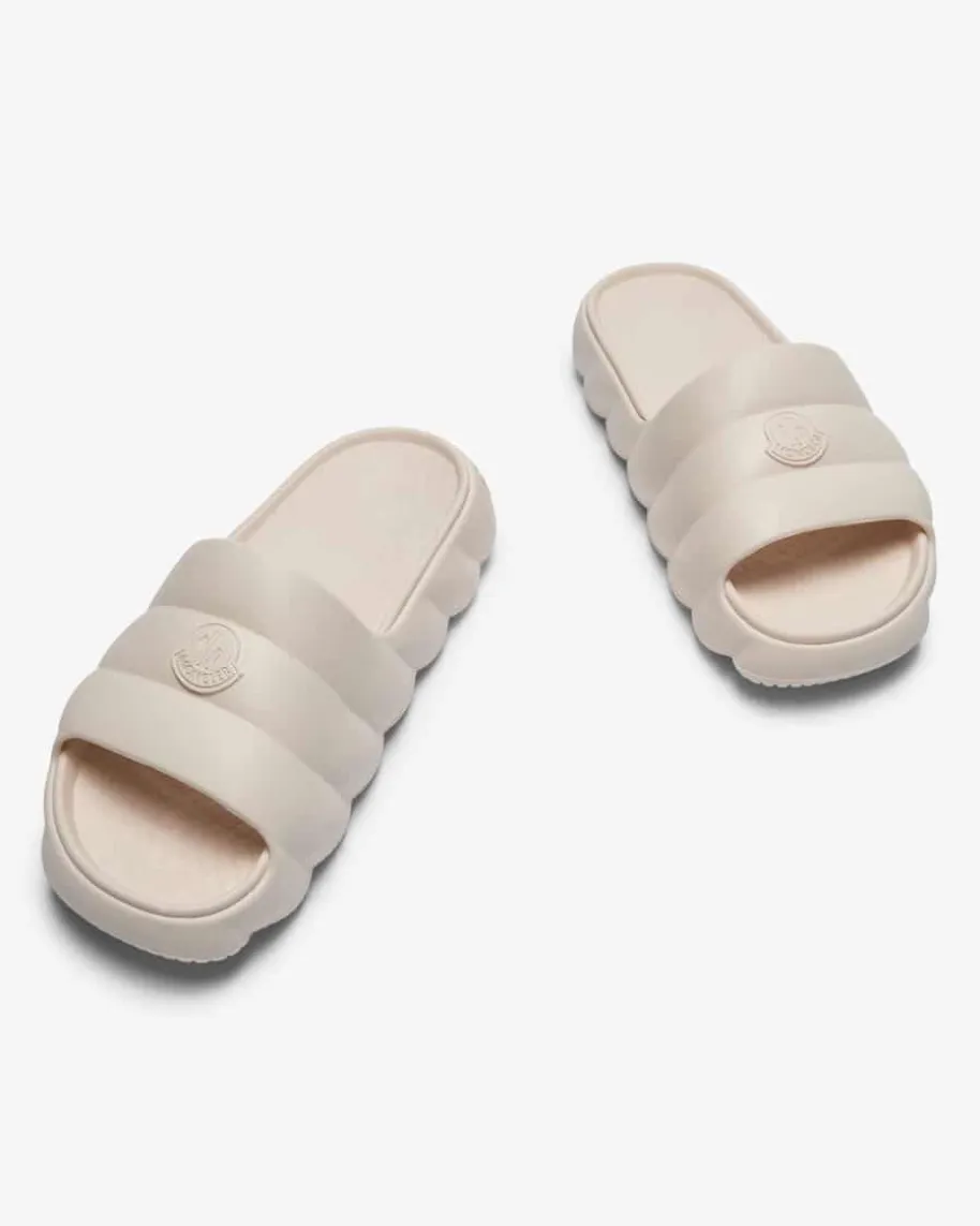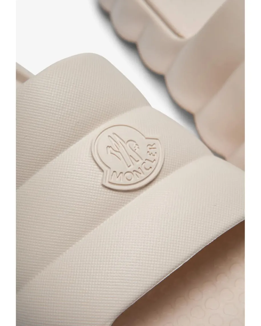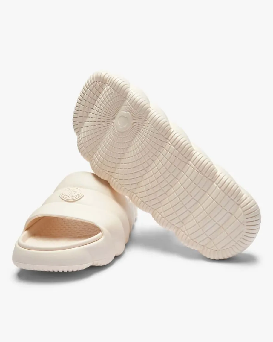 Lilo Pantoletten für Damen von Moncler in Creme. Das Modell präsentiert sich inraffinierter Aufmachung und gestepptem Design, wodurch ein modischer Begleiterfür den Sommer entsteht. Logo-Details runden das Gesamtbild gekonnt ab.