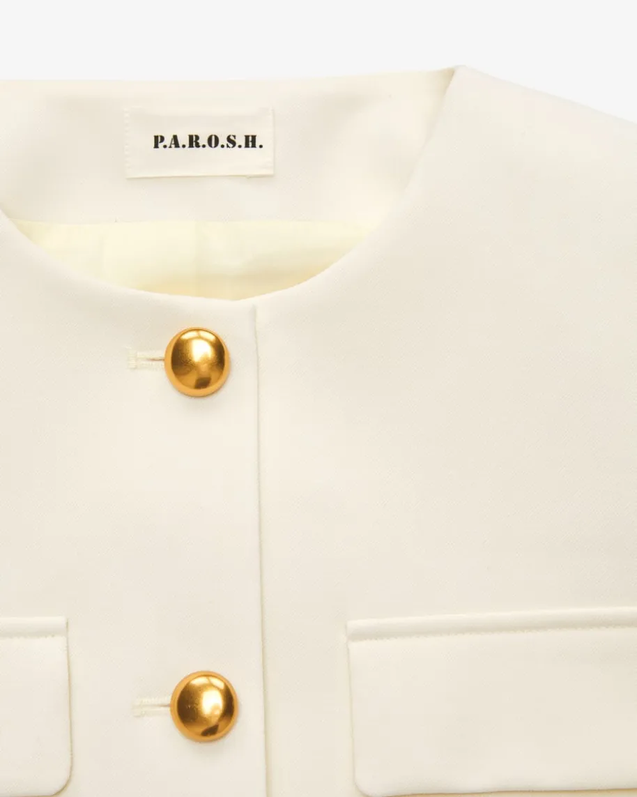 Liluxy25 Blazer für Damen von Parosh in Creme. Die Marke steht für verspielteDesigns mit Vintage-Flair – farbenfrohe Prints, Glitzer und Retro-Vibes made inItaly. Das Modell überzeugt in modernem Schnitt, während der hochwertigeSchurwoll-Mix für angenehme Tragemomente beschert. Die markanten goldfarbenenKugelknöpfe und zahlreichen Taschen kreieren einen besonderen Begleiter fürvielseitige Looks.