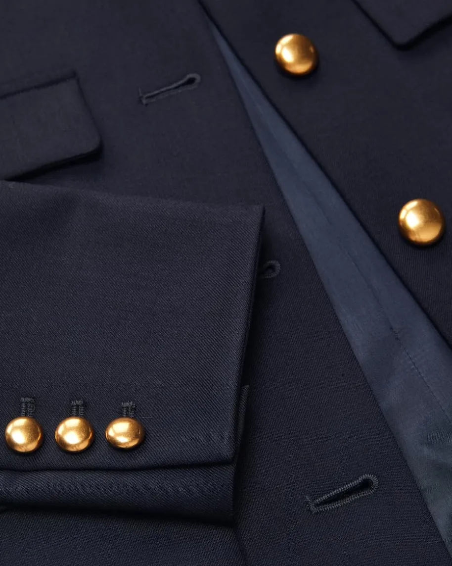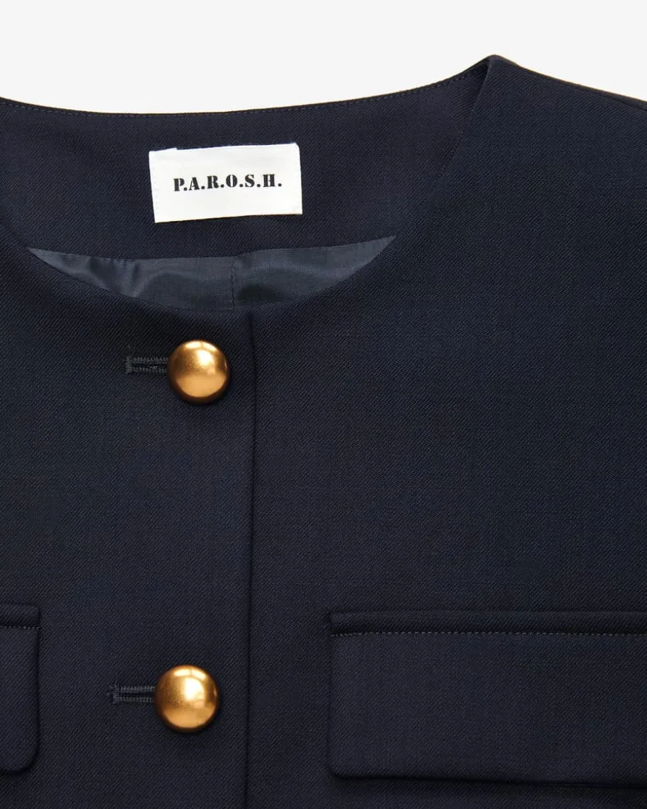 Liluxy25 Blazer für Damen von Parosh in Navy. Die Marke steht für verspielteDesigns mit Vintage-Flair – farbenfrohe Prints, Glitzer und Retro-Vibes made inItaly. Das Modell überzeugt in modernem Schnitt, während der hochwertigeSchurwoll-Mix für angenehme Tragemomente beschert. Die markanten goldfarbenenKugelknöpfe und zahlreichen Taschen kreieren einen besonderen Begleiter fürvielseitige Looks.