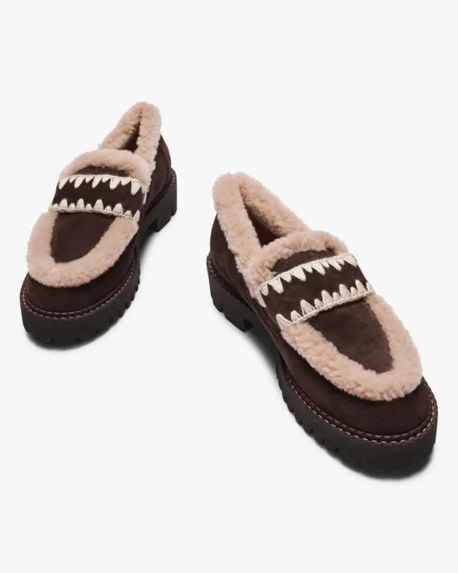 Loafer für Damen von Trumans in Dark Chocolate und Sand. Das Modell besticht alsoptisches und haptisches Highlight, welches durch den kontrastreichen Material-Mix in Kombination mit den Häkel-Rändern am Querriegel geschaffen wird. Zugleichhält Sie das weiche Lammfell-Innenfutter und die markante Gummisohle optimalwarm.
