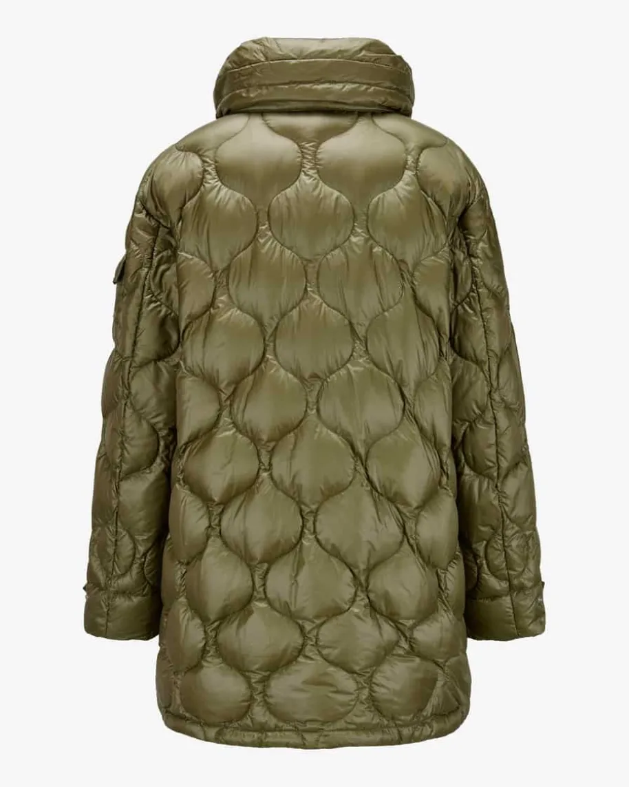 Lombi Daunenparka für Damen von Moncler in Oliv. Denkt man an hochwertige, warmeDaunenjacken, kommt einem unweigerlich das italienische Traditionslabel Monclerin den Sinn. Auch mit diesem Modell präsentiert das Label dank der hochwertigenDaunen-Feder-Füllung einen optimalen Begleiter für vielseitige Winter-Looks,welcher durch das voluminöse Steppmuster in Rautenform und die labeltypischeLogo-Applikation in Szene gesetzt wird.