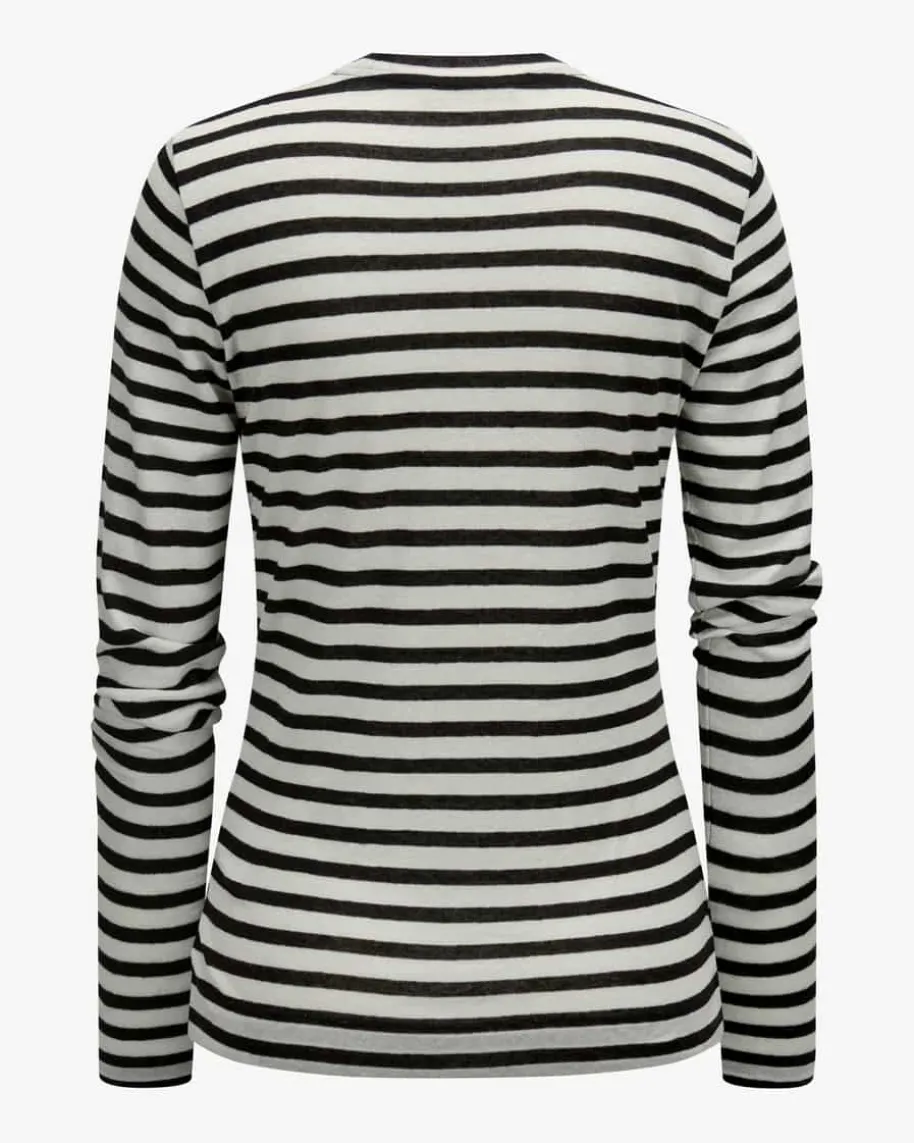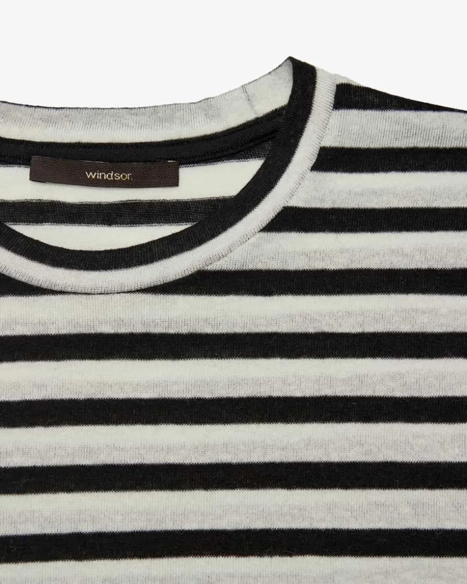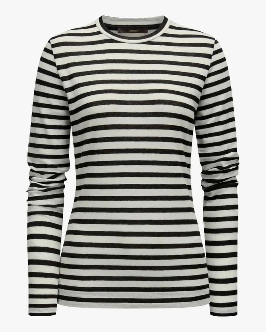Longsleeve für Damen von Windsor in Schwarz und Creme. Das gestreifte Modellzeichnet sich besonders durch die elastische Kombination aus Lyocell und Wolleaus, welche dank der Feinstrick-Qualität eine angenehme Haptik erhält – Einmoderner Layering-Favorit.