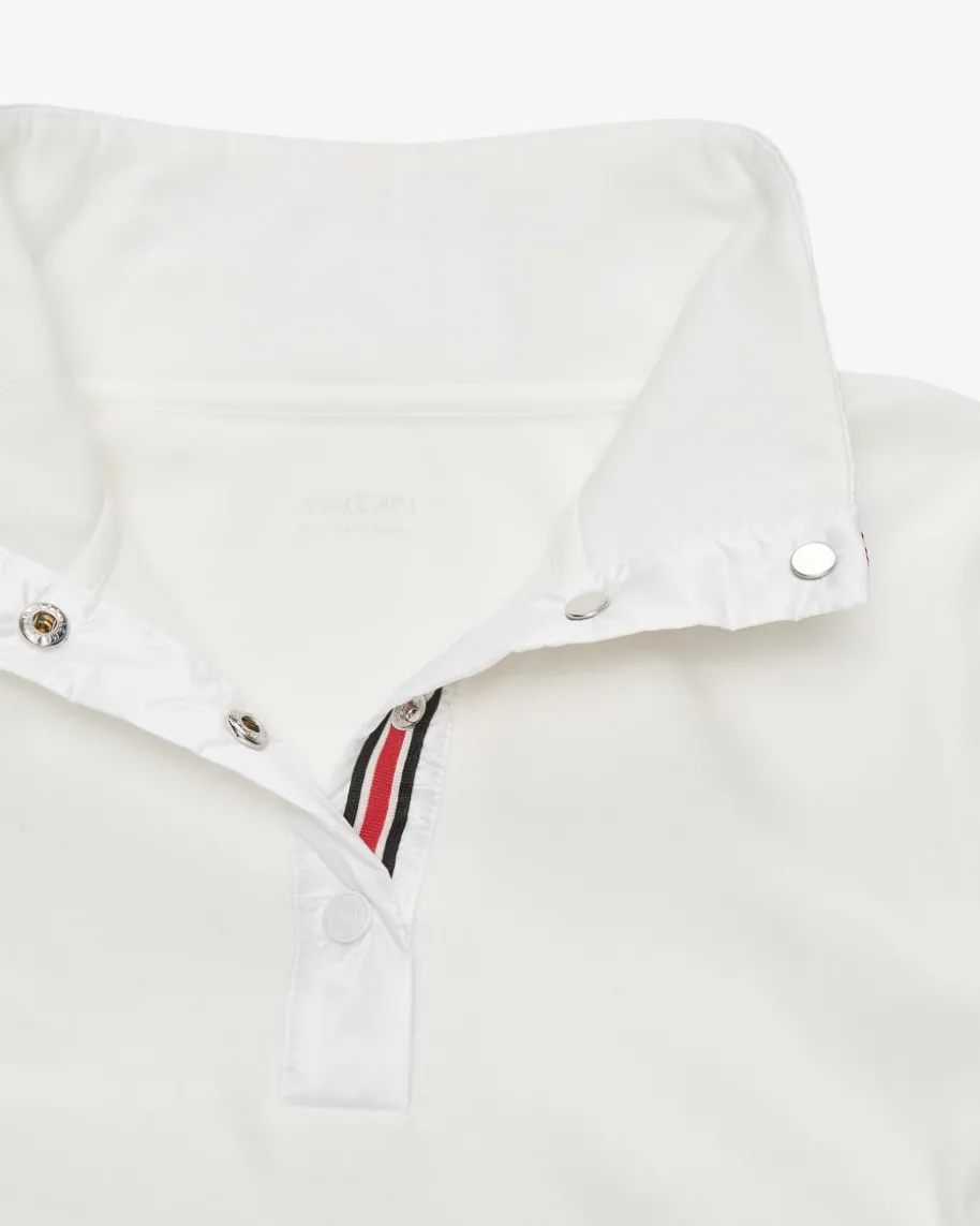 Longsleeve für Damen von Marc Cain in Off-White. Die deutsche Markesteht für selbstbewusste, feminine Looks. Auch dieses Modell präsentiert sichmit schmaler Silhouette und leichter Rippstrick-Verarbeitung, während der dezentchangierende Stehkragen mit gestreifter Borte den sportiven Charakter mitwinterlichem Touch unterstreicht.