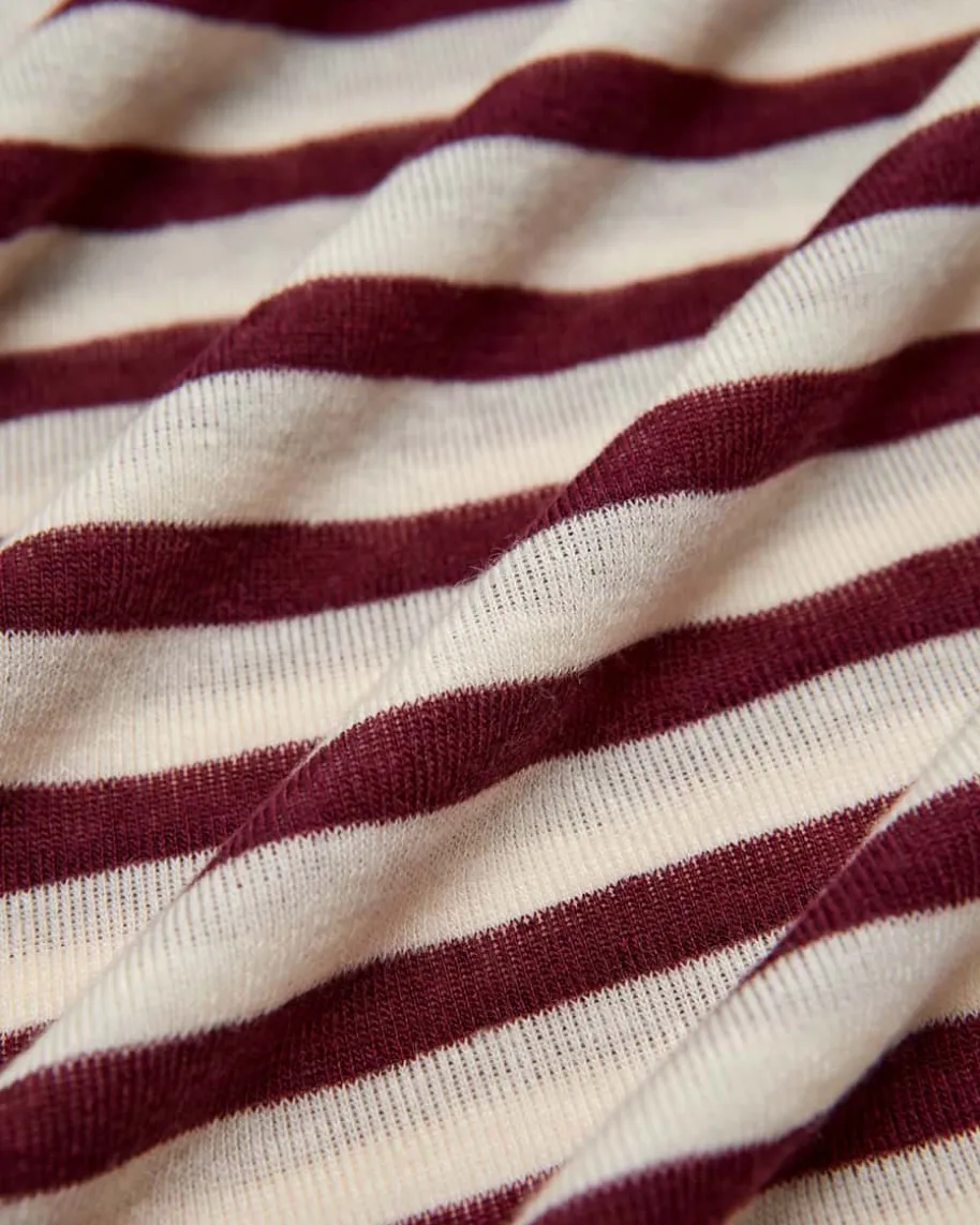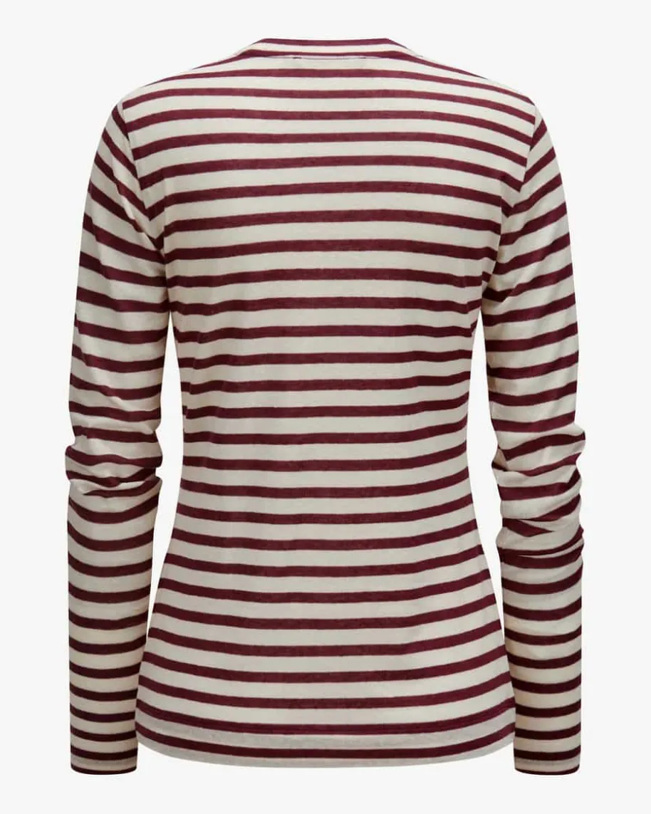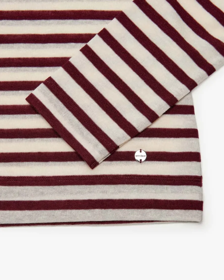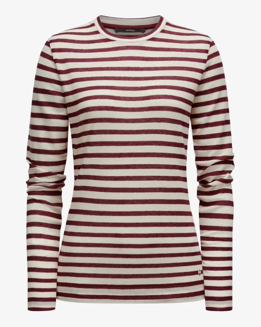 Longsleeve für Damen von Windsor in Bordeaux und Creme. Das gestreifte Modellzeichnet sich besonders durch die elastische Kombination aus Lyocell und Wolleaus, welche dank der Feinstrick-Qualität eine angenehme Haptik erhält – Einmoderner Layering-Favorit.