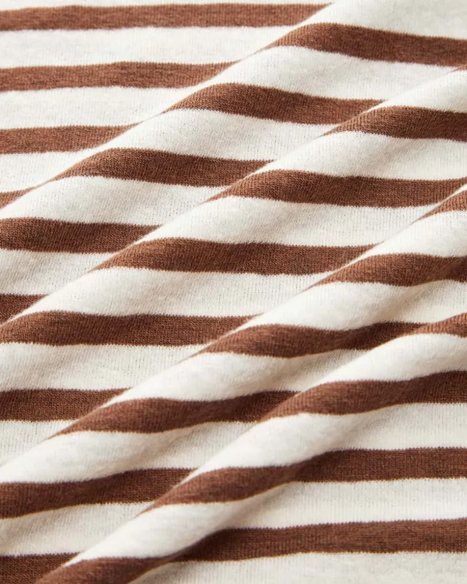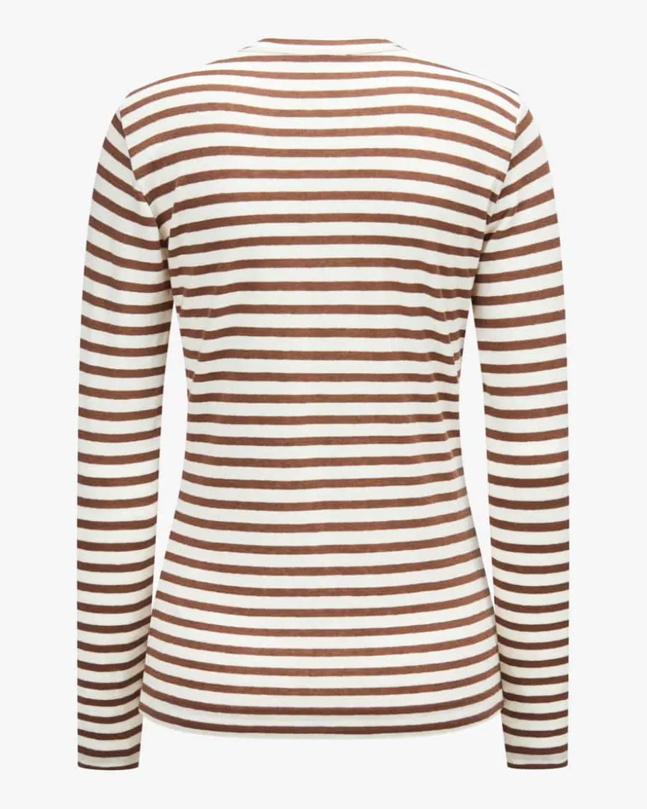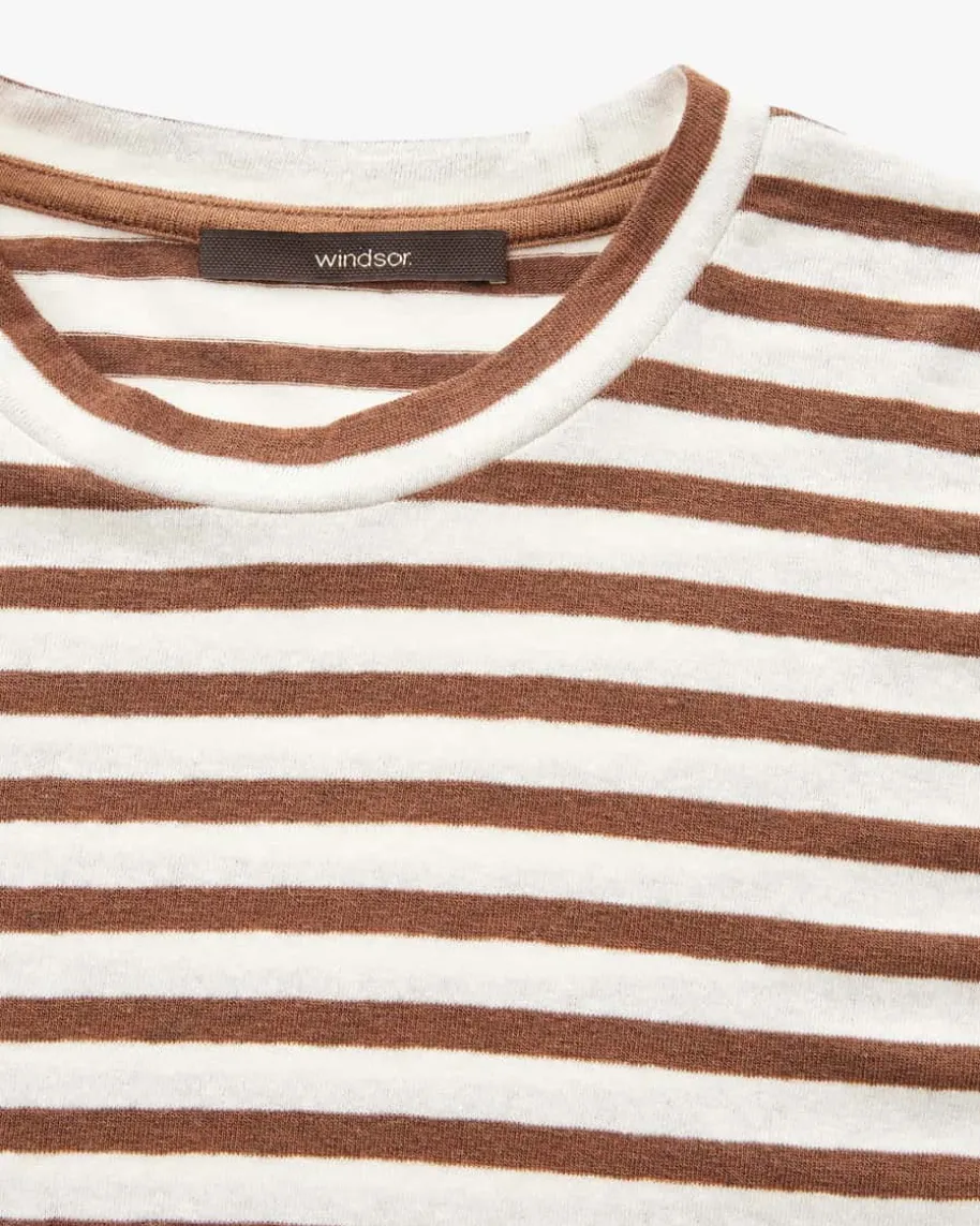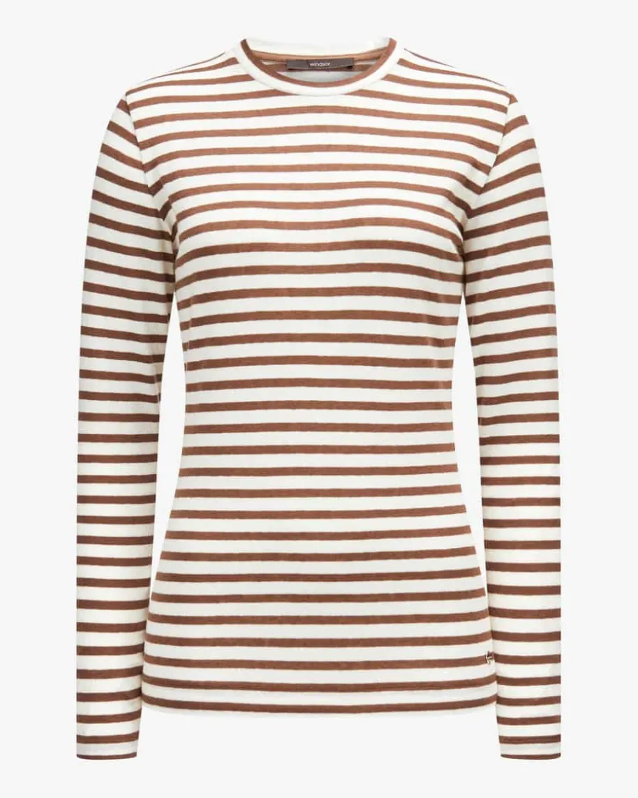 Longsleeve für Damen von Windsor in Hellbraun und Creme. Das gestreifte Modellzeichnet sich besonders durch die elastische Kombination aus Lyocell und Wolleaus, welche dank der Feinstrick-Qualität eine angenehme Haptik erhält – Einmoderner Layering-Favorit.