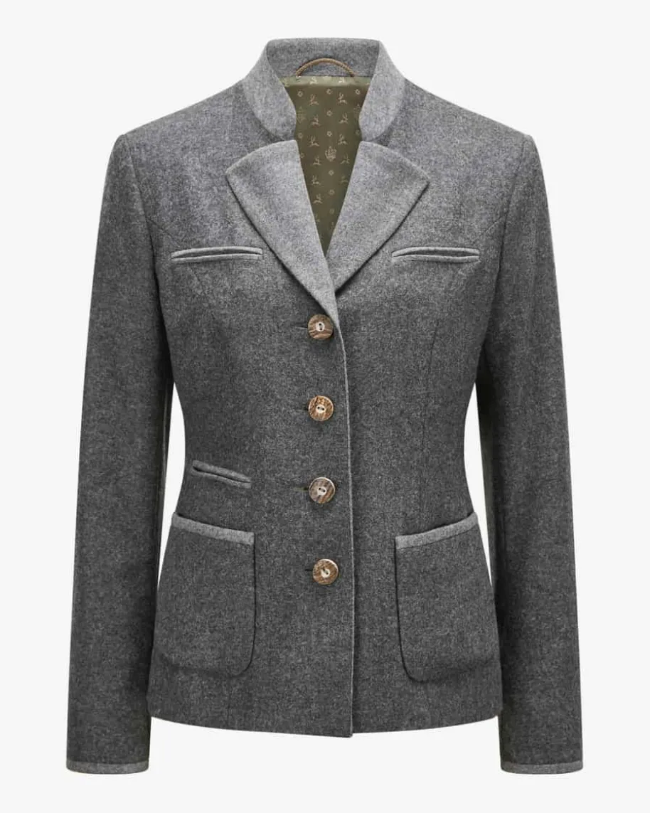Lore Trachtenblazer für Damen von Habsburg in Anthrazit und Grau. Das Modell aushochwertigem Schurwoll-Mix präsentiert sich dank der Paspelierungen sowie demchangierenden Innenfutter in traditioneller Aufmachung, während der taillierteSchnitt das Gesamtbild feminin abrundet.