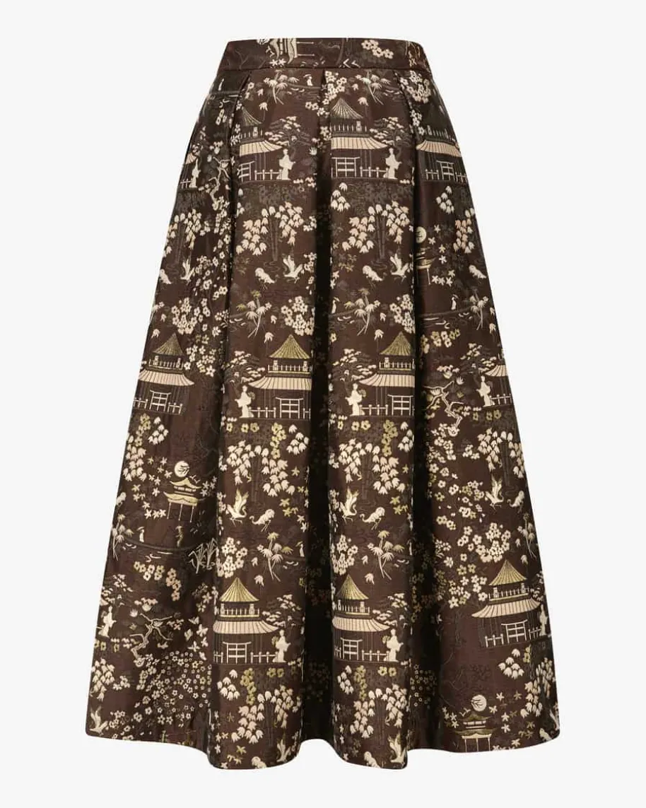 Luna Asia Rock für Damen von Lunatica Milano in Braun, Gold und Creme. LunaticaMilanosteht für handgefertigte Röcke made in Italy – extravagant, farbenfroh undvoller La-Dolce-Vita-Charme. Mit extravagantem Asia-Motiv in hochwertigerJacquard-Verarbeitung, femininer A-Linie und markanten Kellerfalten wird diesesModell zum echten Hingucker und verleiht jedem Outfit das gewisse Etwas.