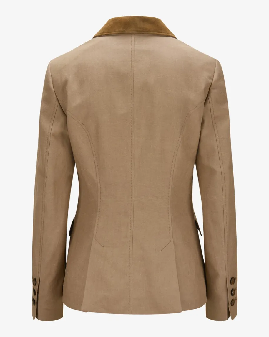 Lyon Trachten-Blazer für Damen von Meindl in Latte. Das traditionelle Modellüberzeugt durch zeitlose Eleganz in hochwertiger Baumwoll-Leinen-Qualität. Diefeminine Passform und tonigem Leder-Besatz runden den Trachten-Style harmonischab.