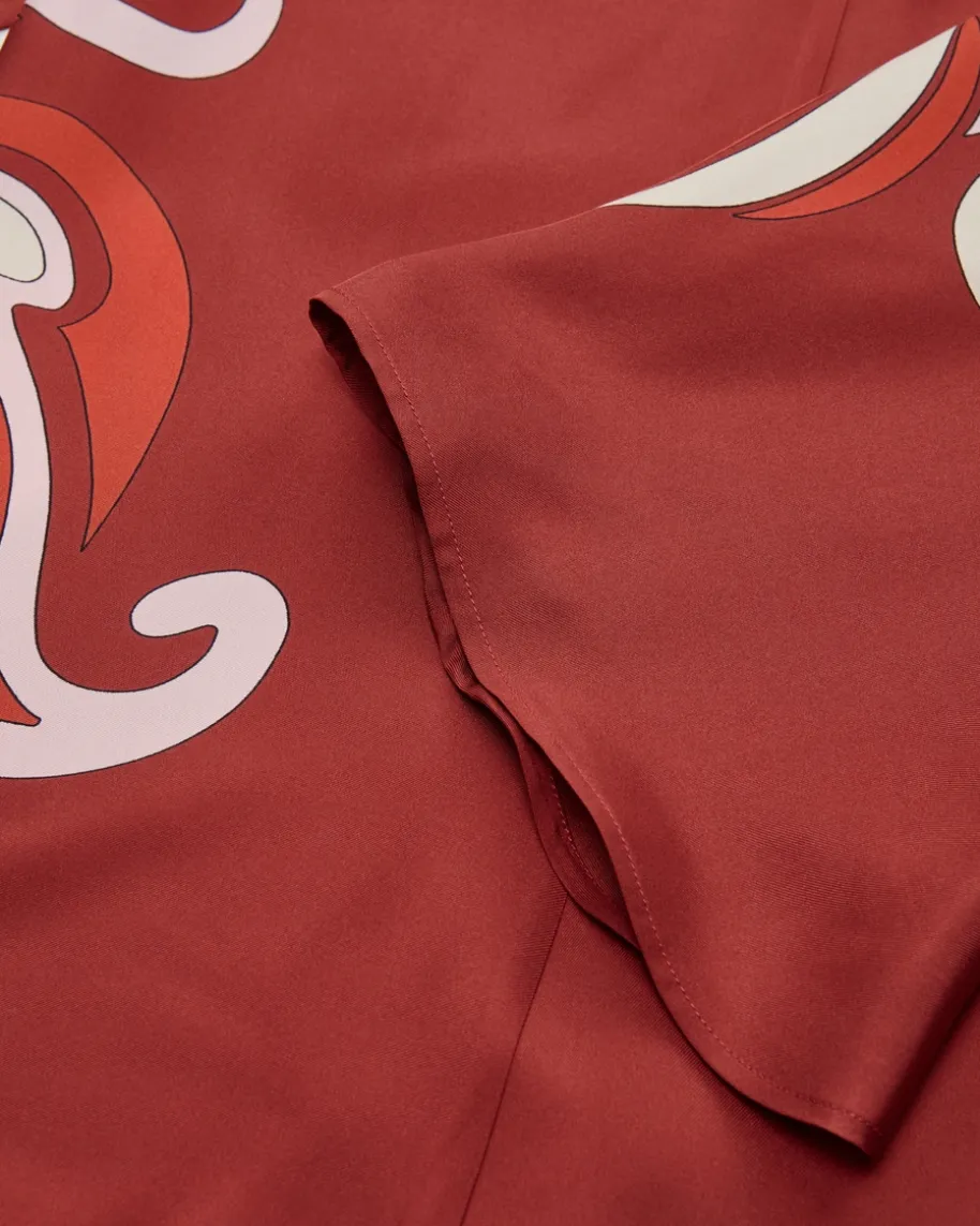 Magnifico Seidenkleid für Damen von La DoubleJ in Dunkelrot, Creme und Rosa. DasModell präsentiert sich dank der raffinierten Passform und Trompetenärmeln infemininer Aufmachung, während der kreative Ornament-Print ein modischesGesamtbild mit Sinn für Stil kreiert. Die hochwertige Seiden-Qualität in Twill-Verarbeitung sorgt für angenehmen Tragekomfort und schafft eine edel fließendeOptik.