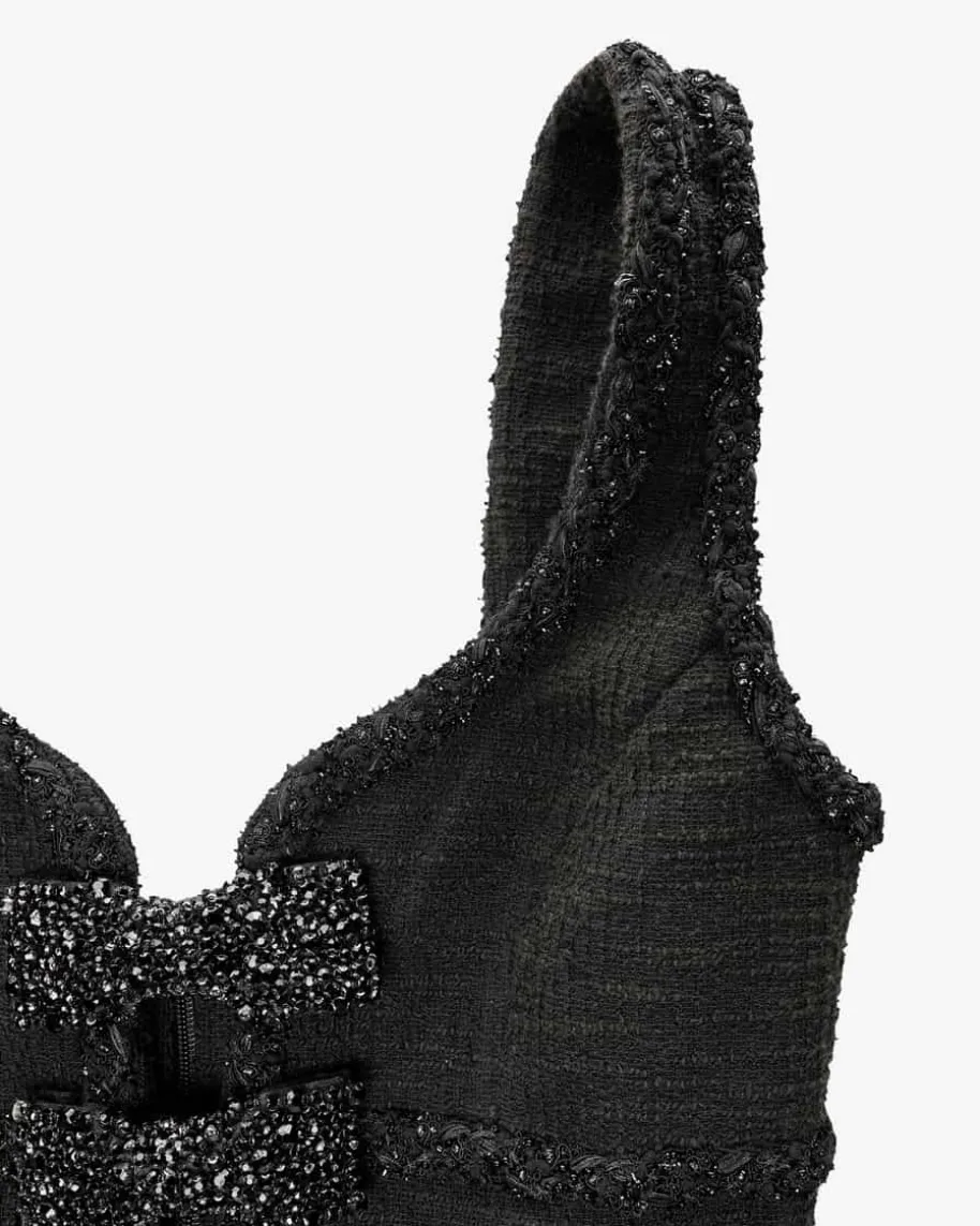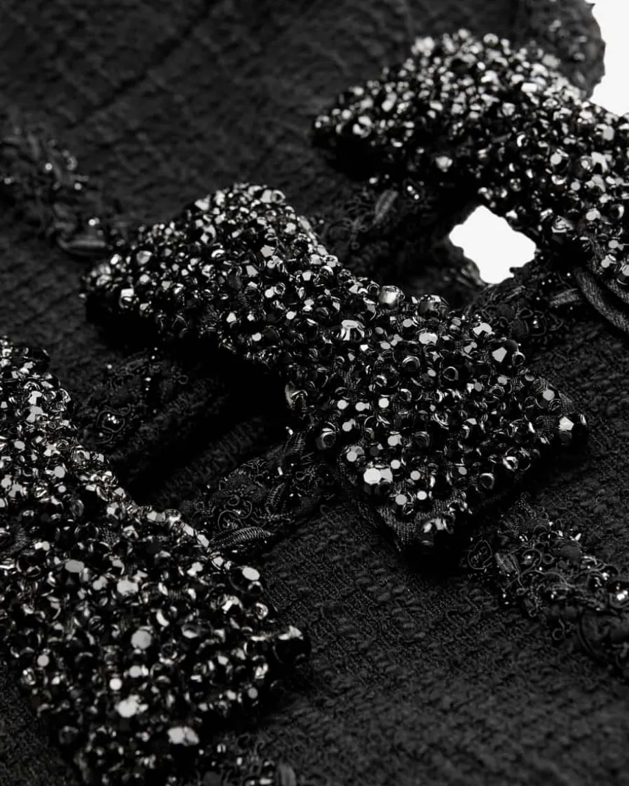Margo Kleid für Damen von Rebecca Vallance in Schwarz. Das kleine Schwarze mitbesonderem Twist – Das feminine Design besticht in klassisch-eleganter Bouclé-Aufmachung, während die changierenden Schmuckstein-Applikationen zusammen mitden aufgesetzten Schleifen ein extravagantes Finish verleihen.