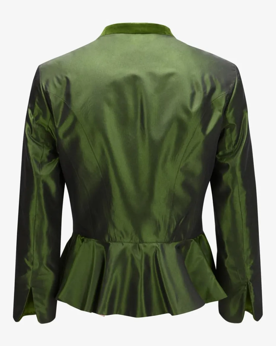 Marie-Valerie Trachtenblazer für Damen von Stajan in Grün. Made in Austria –Aus hochwertiger Seiden-Qualität gefertigt, präsentiert sich das taillierteModell dank kontrastierendem Innenfutter, doppelreihiger Knopfleiste sowie desklassischen Designs in traditionell-authentischer Aufmachung. Zugleich rundendas Schößchen sowie edle Samt-Partien den Trachten-Look feminin ab.