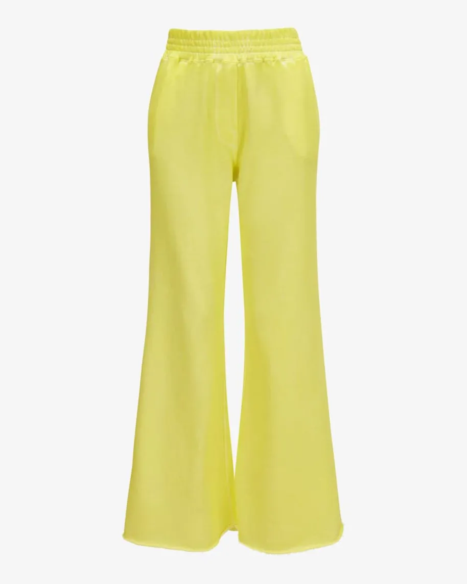 Mayari Sweathose für Damen von Love Joy Victory in Gelb. Das Modell ausangenehmer Bio-Baumwolle präsentiert sich in legerer Sweat-Aufmachung, währenddas ausgestellte Bein dem sonst sportivem Look ein modernes Update verleiht.Zugleich rundet die Batik-Aufmachung das Gesamtbild modisch ab.