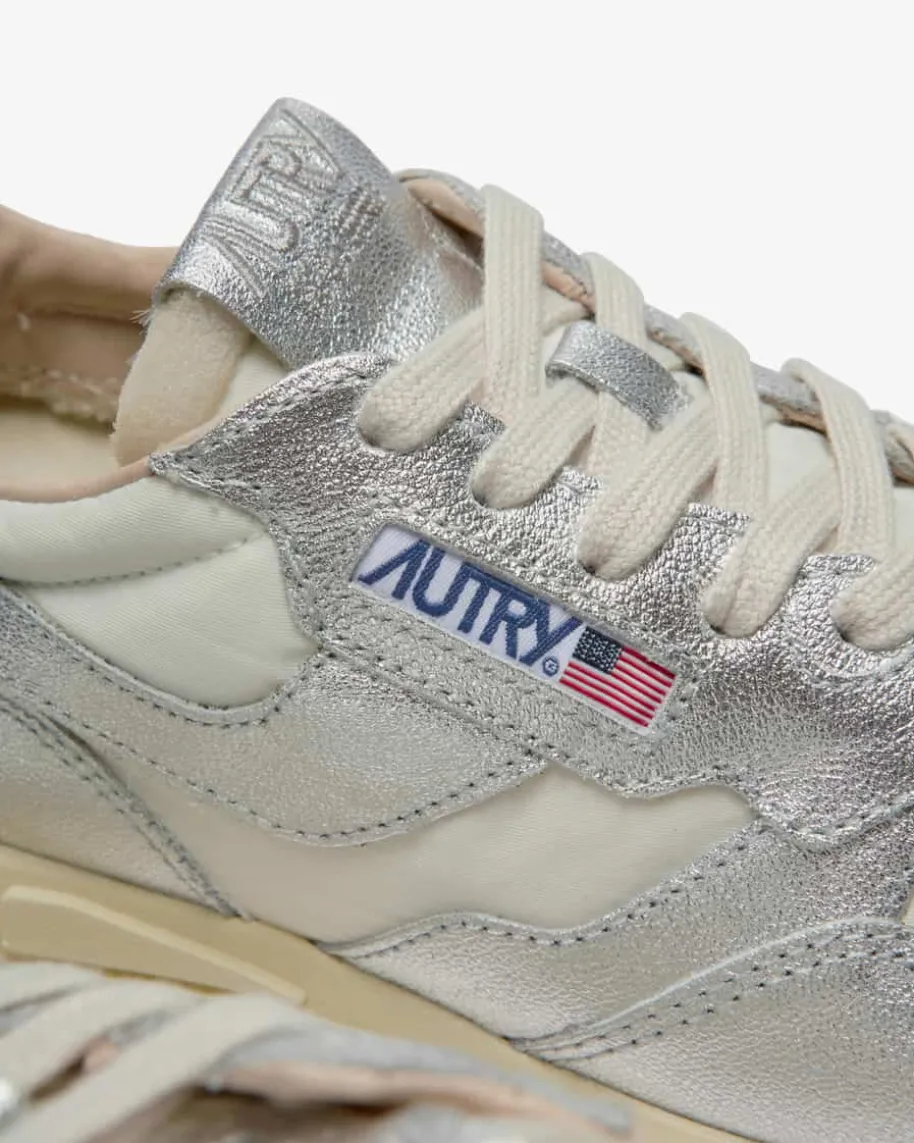Metallic Reelwind Low Sneaker für Damen von Autry in Silber und Off-White. Das1982 in Dallas gegründete Label etablierte sich zu einem der beliebtestenSneaker-Marken der 1980er Jahre und feierte 2019 sein Comeback. Für diesesModell ließ sich die Marke von dem dynamischen Design der Runner inspirieren undverbindet fließend die Innovation von Performance-Schuhen mit der Ästhetik der80er Jahre. Der aus genarbtem Leder und glattem Textil gefertigte Reelwind isteine außergewöhnliche Kombination aus Stil und Funktionalität.