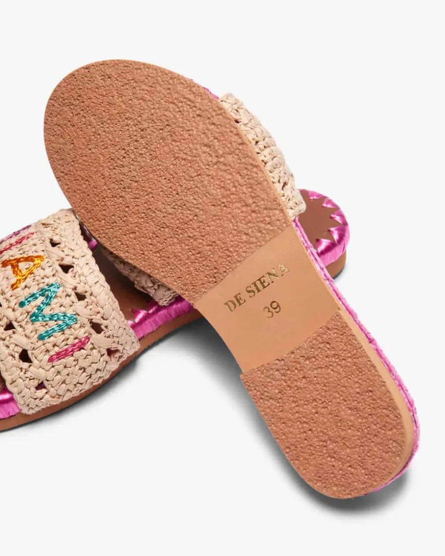 Miami Beach Pantoletten für Damen von De Siena in Natur, Pink und Braun. Dankder modischen Bast-Aufmachung besticht das Modell als sommerlicher Favorit, während der gestickteSchriftzug dem Gesamtbild den letzten Schliff verleiht.