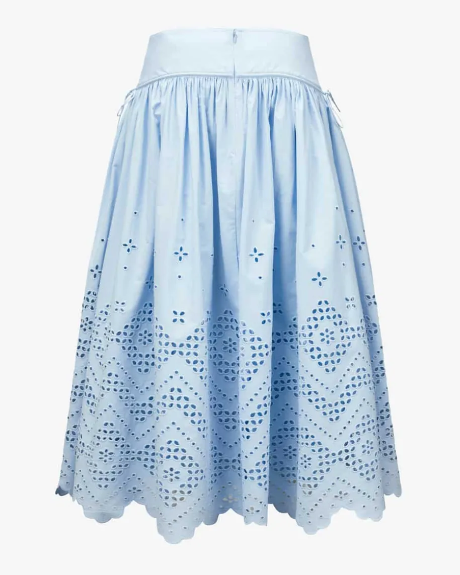 Midirock für Damen von Self-Portrait in Hellblau. Das Modell begeistert mitsemi-transparenter Lochspitze und femininen Details, die für das gewisse Etwassorgen. Der gereihte Rock in Kombination mit der zarten Muschelkante zauberteinen romantischen Look. Das Modell kann mit dem passenden Top getragen werden.