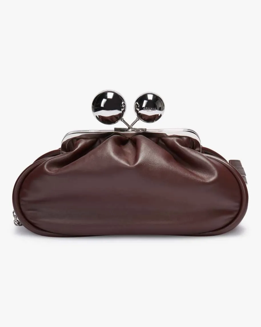 Milvanew Umhängetasche für Damen von Weekend Max Mara inDunkelbraunund Silber. Diemittelgroße Pasticcino Bag aus glänzendem Nappaleder isteine Super-Clutch, diedeinem Alltagslook eine persönliche und faszinierende Noteverleiht. DerMetallverschluss mit großen Weekend Max Mara Kugeln setztzudemcharakteristische Akzente