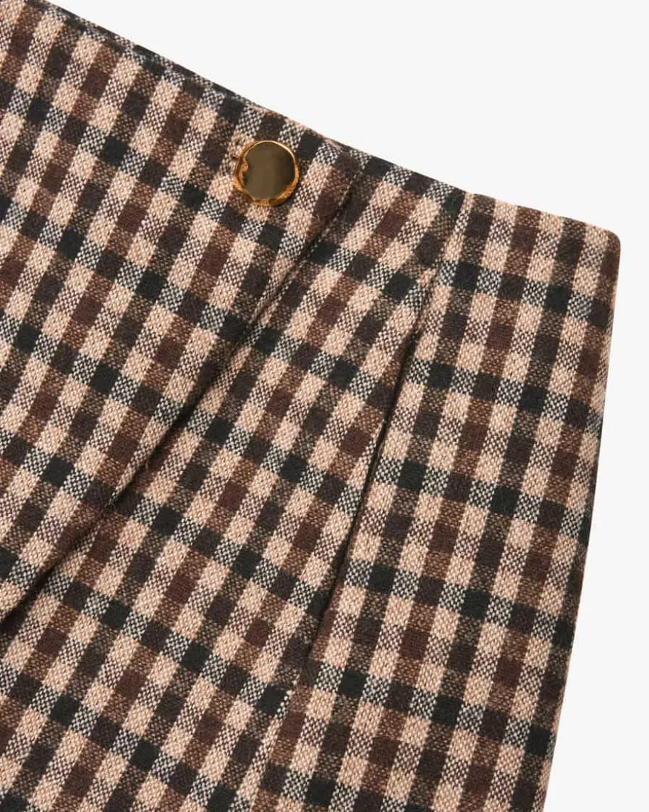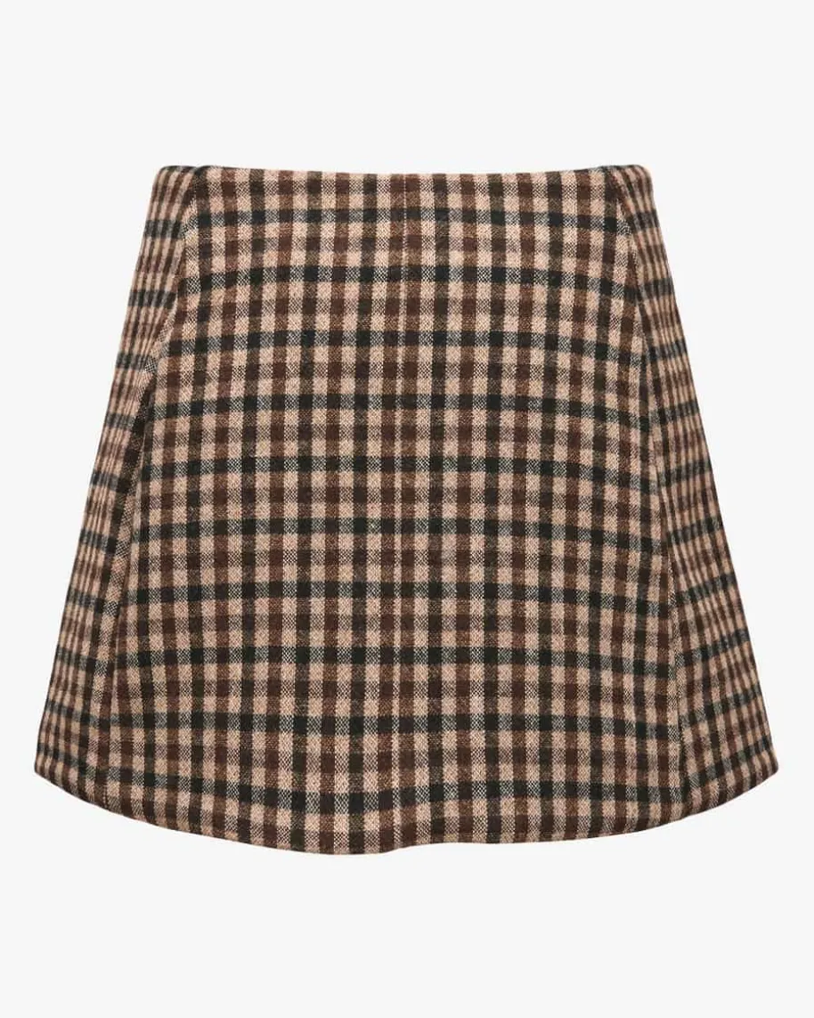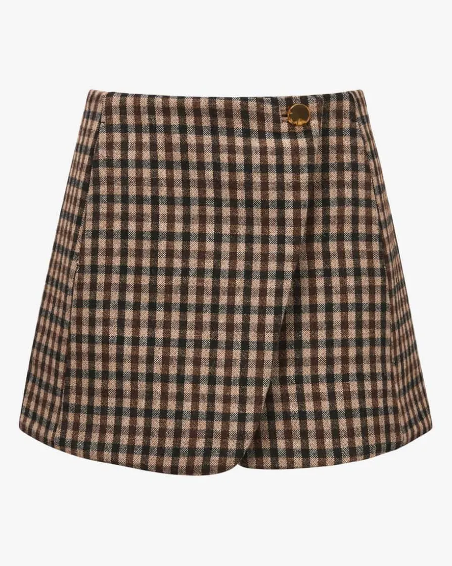 Minirock für Damen von Ganni in Beige, Braun und Schwarz. Skandinavischer Stilmit Attitude – unkompliziert, kreativ und voller Persönlichkeit. Mit diesemModell präsentiert das Label einen femininen Pre-Fall-Favorit im robustenStruktur-Design mit modernem Karomuster. Zugleich verleiht die geknöpfte Wickel-Aufmachung mit organisch geformtem, goldfarbenem Knopf einen besonderenCharakter.