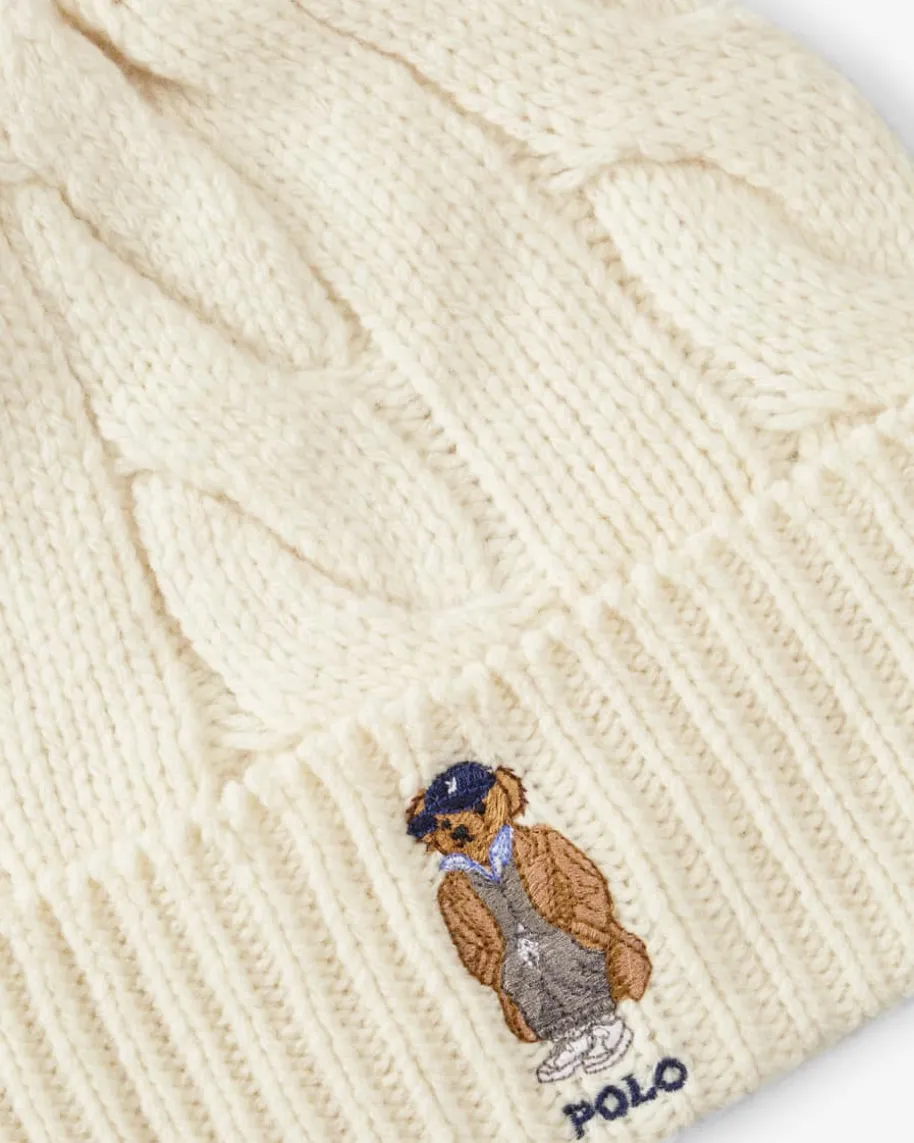 Mütze für Damen von Polo Ralph Lauren in Off-White. Das Modell aus hochwertigemWoll-Mix begeistert in klassischer Beanie-Aufmachung, während das Zopfstrick-Muster mit detailverliebter Polobären-Stickerei einen modernen Begleiter fürkühle Tage kreiert.