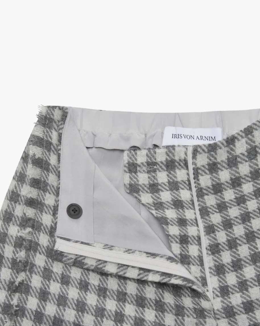 Nelda Hose für Damen von Iris von Arnim in Hellgrau und Grau. Das Modell ausreiner Cashmere-Wolle avanciert dank der weiten Schnittführung sowie demteilelastischen Bund zu einem komfortablen Casual-Favoriten mit weichem Griff,welcher durch das leichte Webdesign mit Karomuster und den seitlichen Fransen-Details einen modernen Country-Charakter erhält.