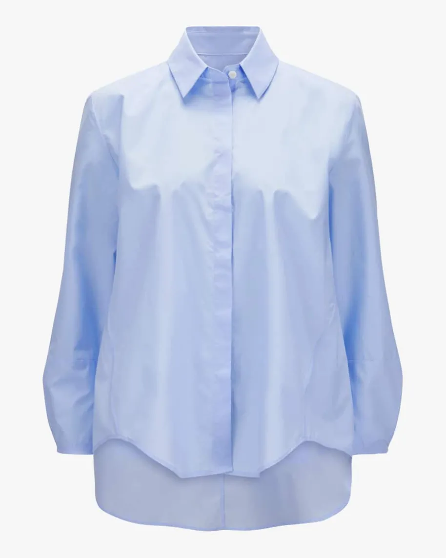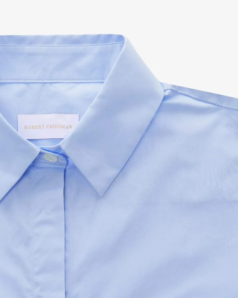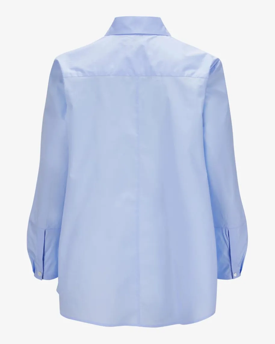 Nora Hemdbluse für Damen von Robert Friedman in Hellblau. Dankder leicht ausgestelltenPassform und verlängerten Manschetten sowie einersommerlichen,semitransparenten Baumwoll-Qualität präsentiert sich dasfeminine Modell inmodischer Aufmachung.