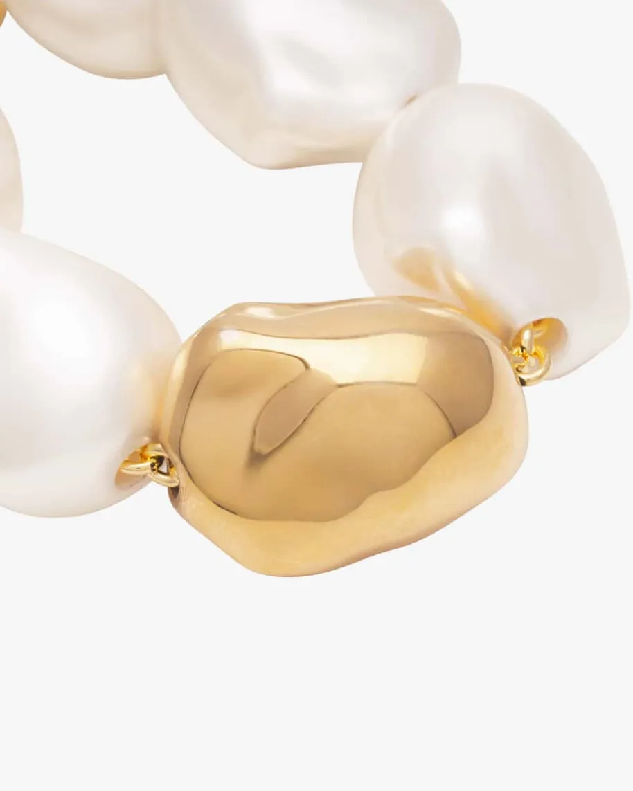 Organic Pearl Armband von Vanessa Baroni in Weiß und Gold. Das im Jahr 2009gegründete Label Vanessa Baroni wurde von der gleichnamigen Designerin gegründetmit dem Ziel, markante Accessoires für angesagte Looks schaffen. Dabei stammtdie Inspiration von Reisen, Kunst sowie der aktuellen Mode. Auch dieses eleganteArmband, mit organisch geformten Perlen, verleihen jedem Anlass eine subtileRaffinesse.