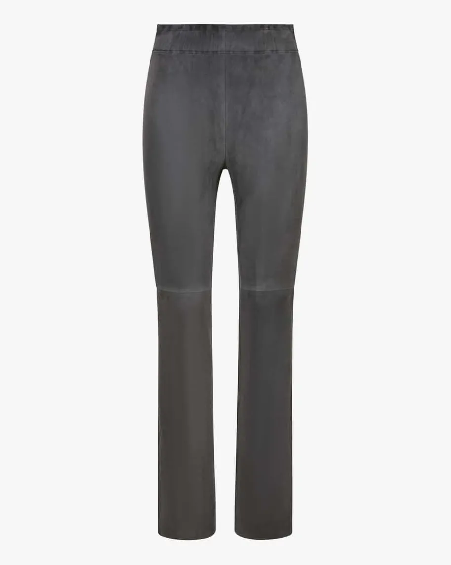 Philine Velo Lederhose für Damen von Iris von Arnim in Blaugrau. DasModell in hochwertigem Lammleder überzeugt mit angenehmen Tragemomenten dank derelastischen Eigenschaften, während die klassischen Details und die Velours-Optikdas Gesamtbild harmonisch abrunden.