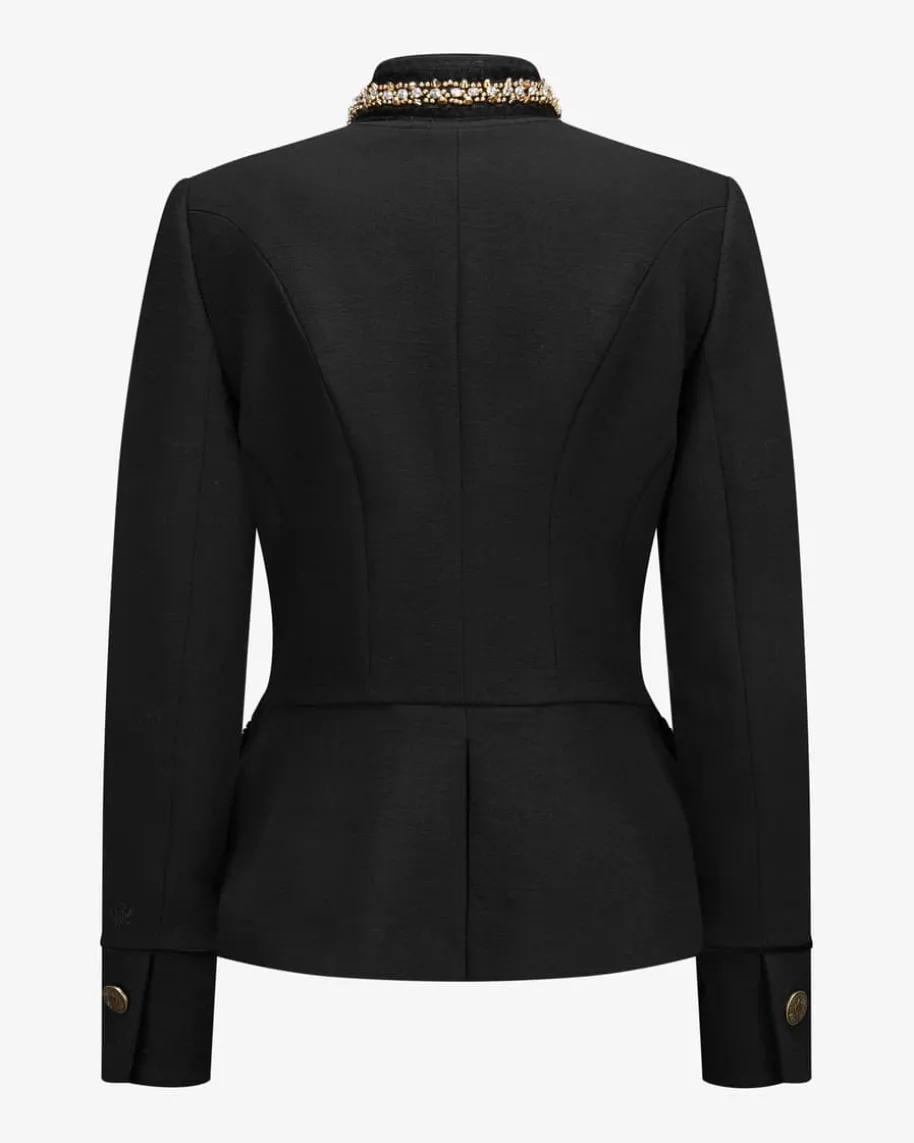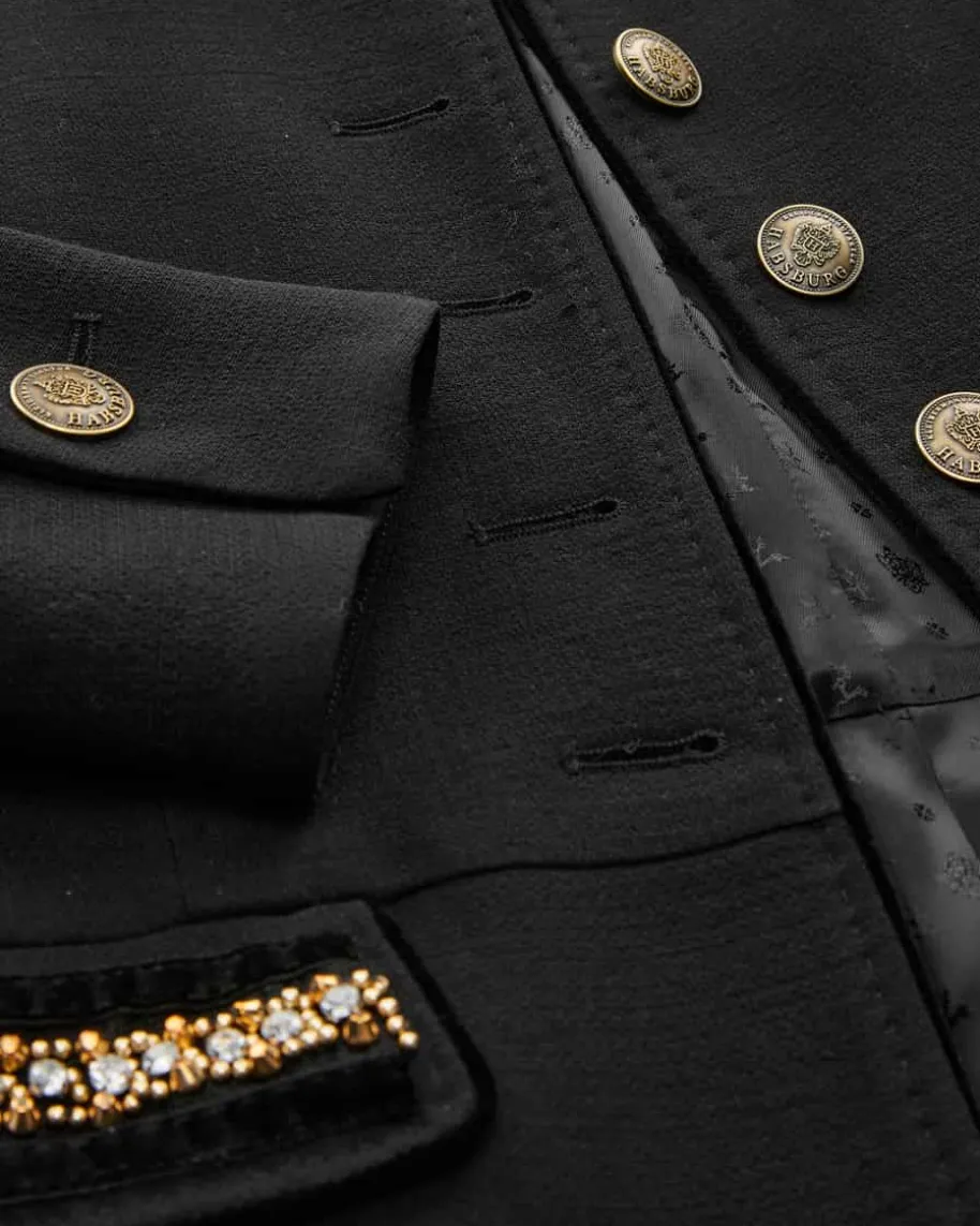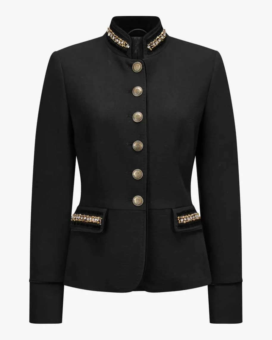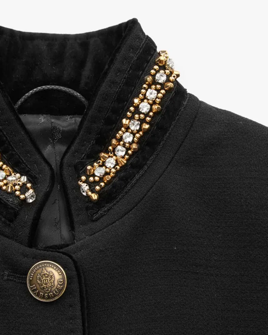 Pöckstein Trachtenblazer für Damen von Habsburg in Schwarz. Das Modellpräsentiert sich in femininer Aufmachung dank des angesetzten Schößchens und demhochwertigen Strass-Stein-Besatz, während klassische Details und die edleSchurwoll-Qualität das Gesamtbild harmonisch abrunden.