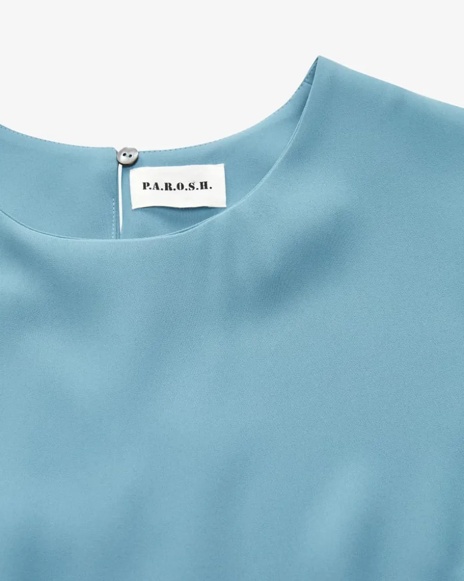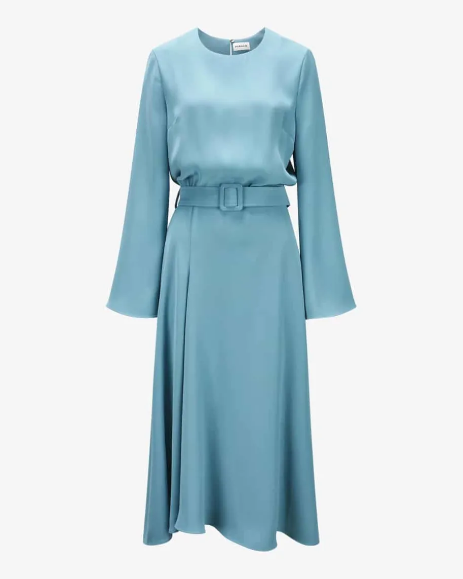 Poker25 Kleid für Damen von Parosh in Rauchblau. Das Modell besticht dankfließender Material-Qualität mit angenehmem Tragekomfort, während dasTaillenband sowie die Trompetenärmel einen femininen Look kreieren.