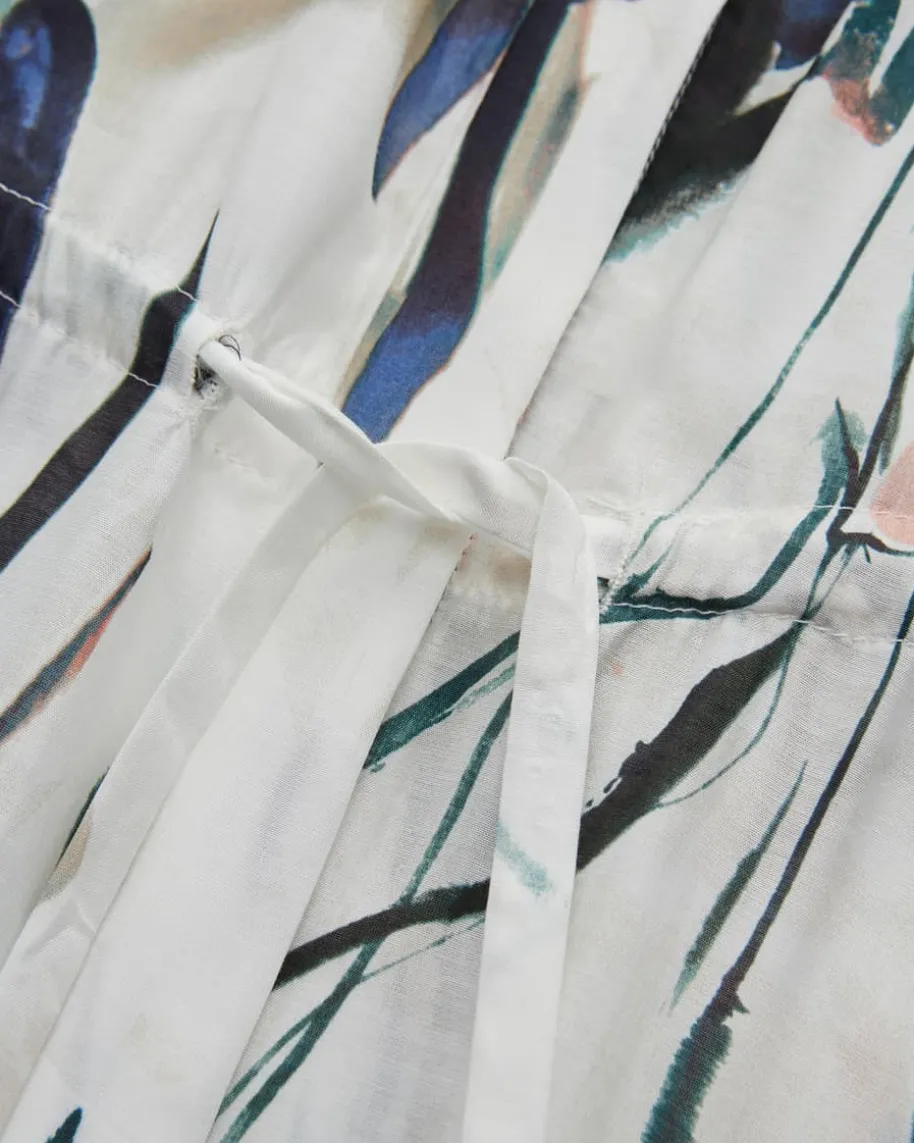 Portland Kleid für Damen von Munthe in Weiß und Bunt. Das Modell überzeugt infließend und zugleich leichter Haptik, während das farbenfrohe Dessin und dermoderne Ärmel in Ballonform das Gesamtbild gekonnt vollenden.