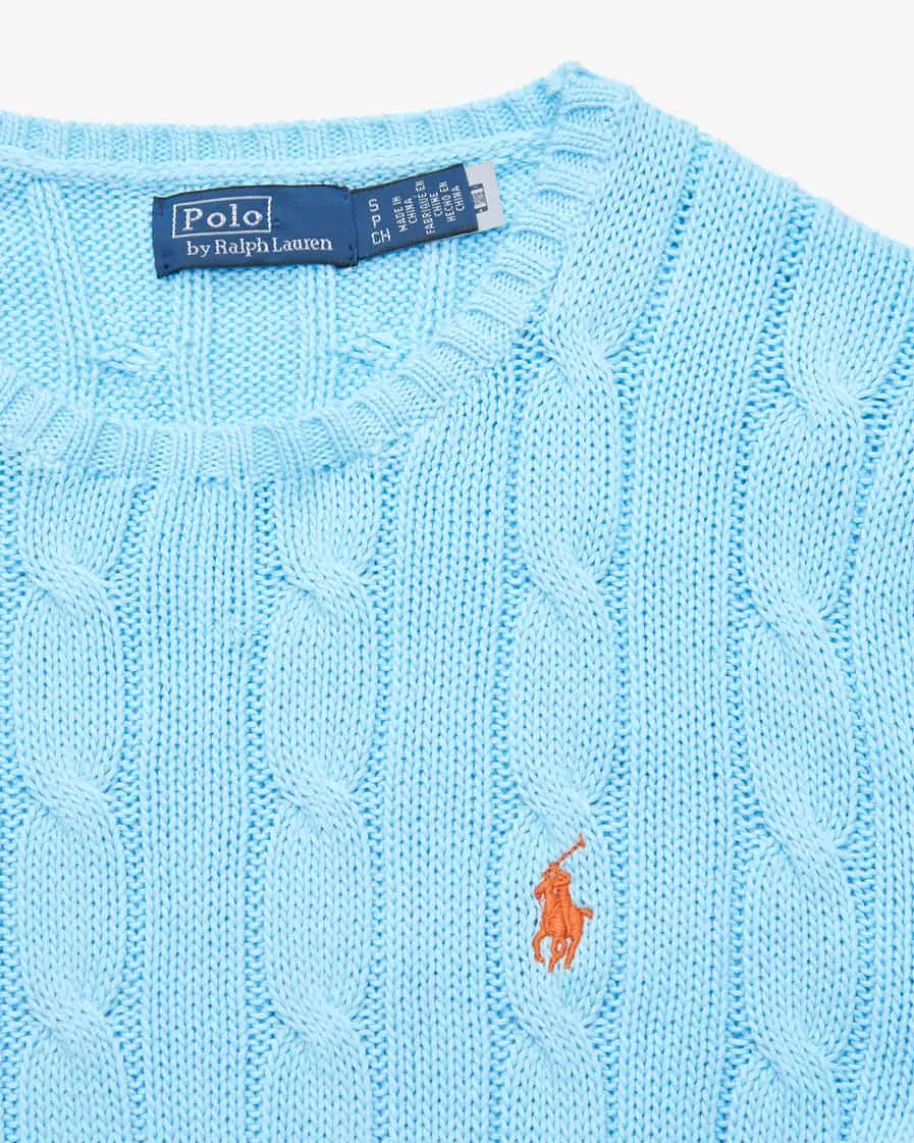 Pullover für Damen von Polo Ralph Lauren in Azur. Qualität, Lifestyle,Authentizität und zeitlose Eleganz – all das zeichnet die Marke Polo RalphLauren seit nunmehr 50 Jahren Firmengeschichte aus. Das Modell präsentiert sichdank der angenehmen Baumwoll-Qualität als zeitloser Favorit, während das moderneZopfstrick-Dessin und die klassischen Details den Look gekonnt vollenden.