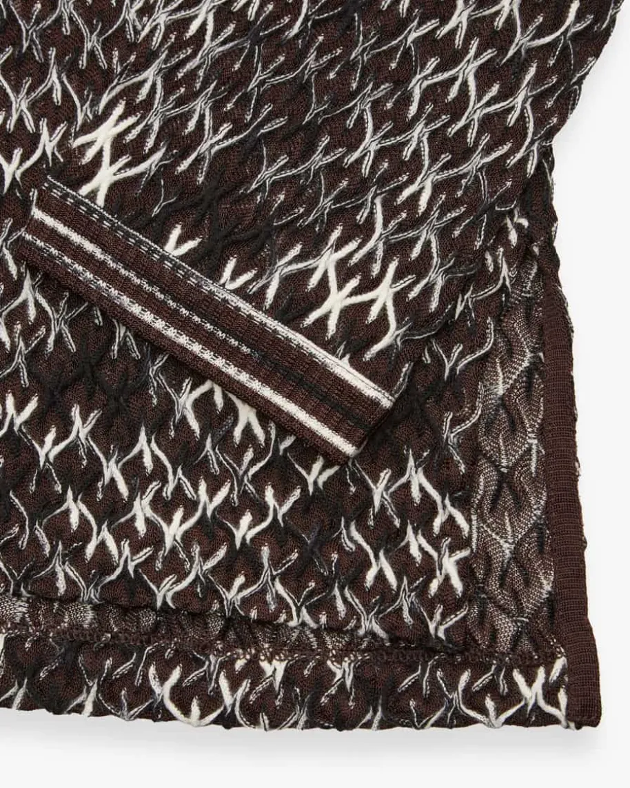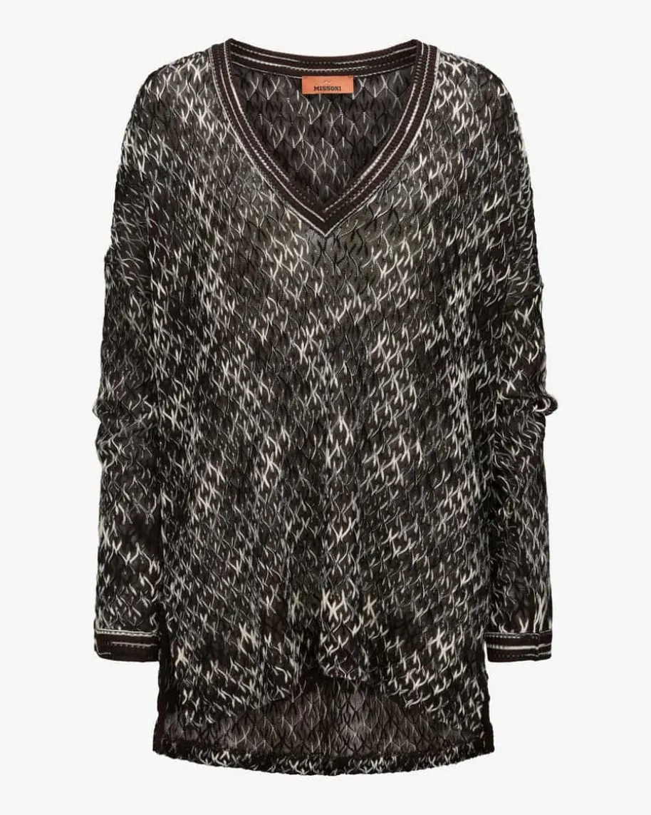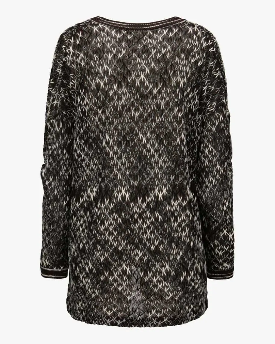 Pullover für Damen von Missoni in Dunkelbraun, Weiß und Schwarz. Dasitalienische Modehaus ist bekannt für farbenfrohe Strickkunst & Zickzack-Muster.Auch dieses Modell überzeugt im einzigartigen Strick-Design mit semi-transparenter Verarbeitung und leichtem Wolle-Viskose-Mix. Die weite Passformmit überschnittenen Schultern schaffen einen legeren Style mit dem gewissenEtwas. Das Modell kann mit der passenden Hose als Set getragen werden.