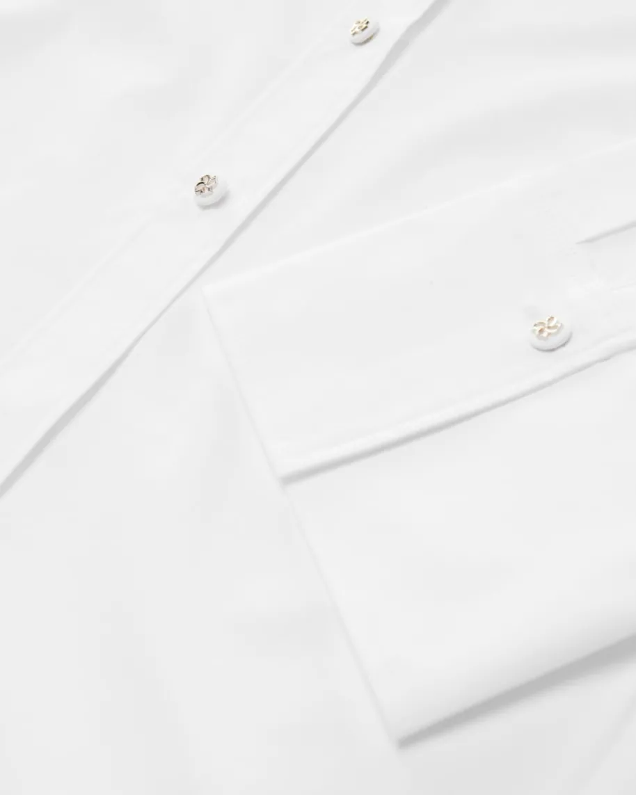 Pure Power Bluse für Damen von Dorothee Schumacher in Weiß. Während dieantaillierte Passform mit Brustabnähern sowie die kurzen Ärmel mit breitenManschetten eine feminine Power-Silhouette kreieren, sorgt die elastischeBaumwoll-Qualität für einen hohen Tragekomfort. Die mit Stoff überzogenen Knöpfeund goldfarbener Applikation sorgen zudem für den letzten Schliff.