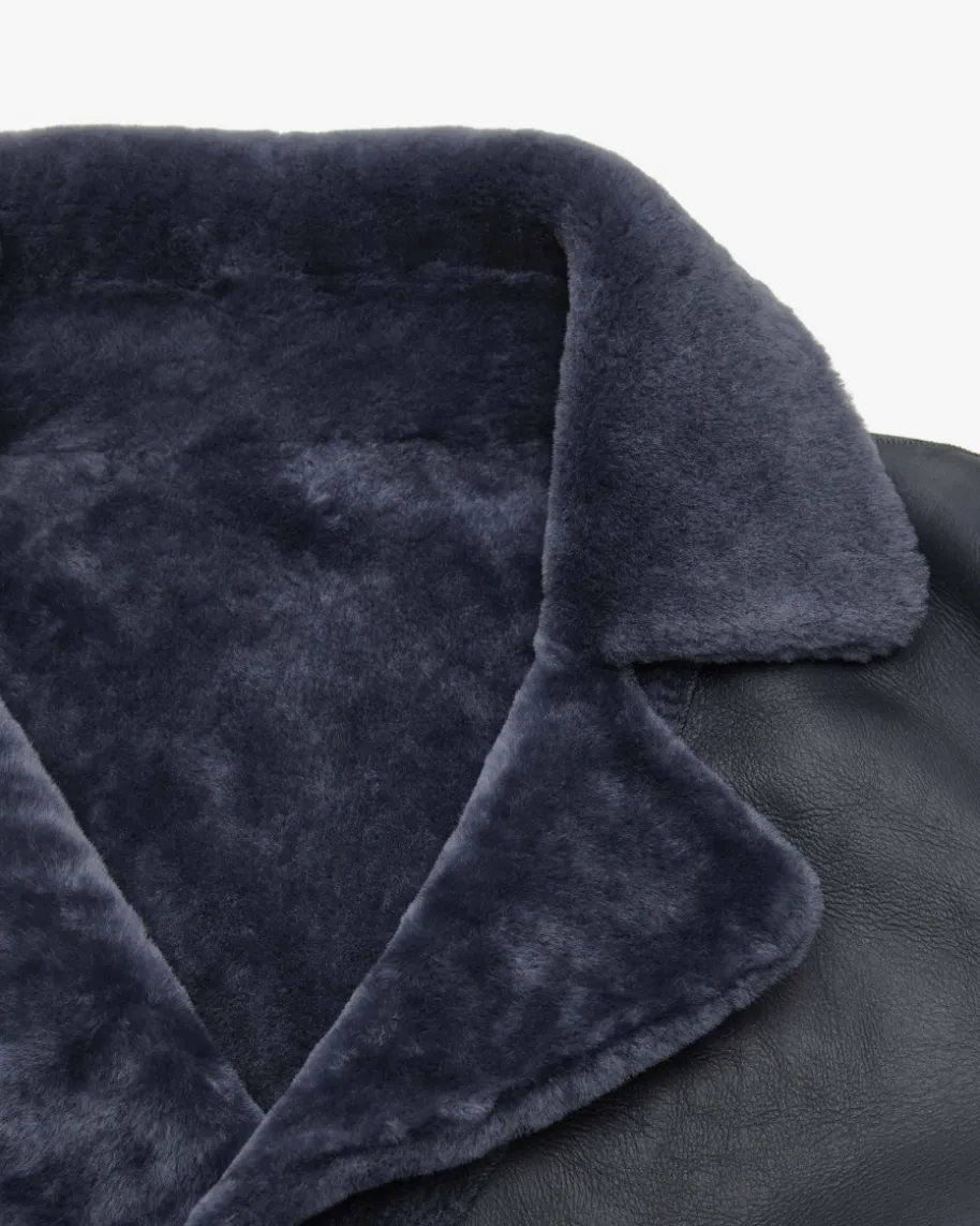 Rachel Schaffelljacke für Damen von Nove in Dunkelblau. Die Marke ist bekanntfür hochwertige Essentials mit Fokus auf Klarheit, Funktionalität und femininerSilhouette. Das Modell zeichnet sich durch die Verwendung von hochwertigemLammleder aus, während die Fell-Innenseite mit seiner weichen und wärmendenEigenschaft optisch sowie haptisch punktet. Zugleich verleiht die zweireihigeAufmachung mit Reverskragen einen modischen Charakter.