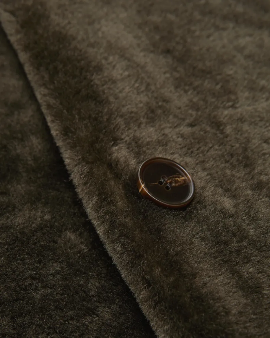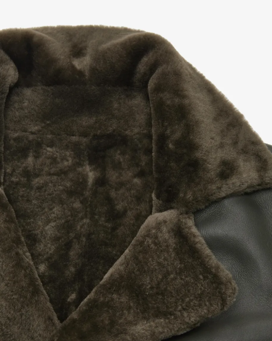 Rachel Schaffelljacke für Damen von Nove in Dunkeloliv. Die Marke ist bekanntfürhochwertige Essentials mit Fokus auf Klarheit, Funktionalität und femininerSilhouette. Das Modell zeichnet sich durch die Verwendung von hochwertigemLammleder aus, während die Fell-Innenseite mit seiner weichen und wärmendenEigenschaft optisch sowie haptisch punktet. Zugleich verleiht die zweireihigeAufmachung mit Reverskragen einen modischen Charakter.