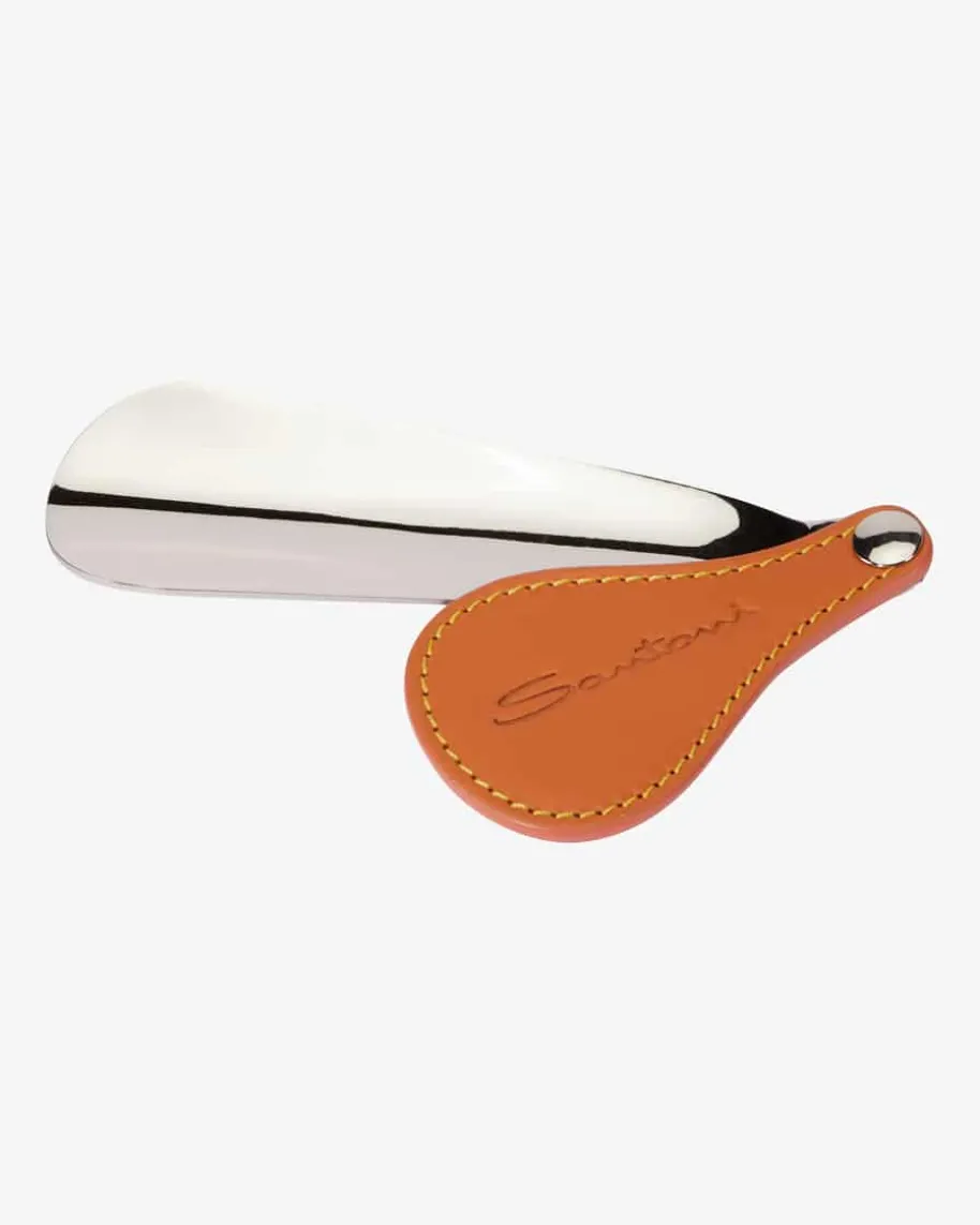 Reise-Schuhlöffel von Santoni in Silber und Orange. Der praktische Schuhlöffelerweist sich dank der klappbaren Funktion als idealer Begleiter, der auf keinerReise fehlen darf.