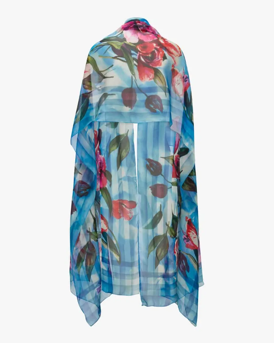 Ritzi1 Seiden-Cape für Damen von Talbot Runhof in Blau und Bunt. Während dieedle Seiden-Qualität sowohl haptisch als auch optisch überzeugt, setzt dasflorale Dessin zusammen mit der semitransparenten Optik feminine Akzente.