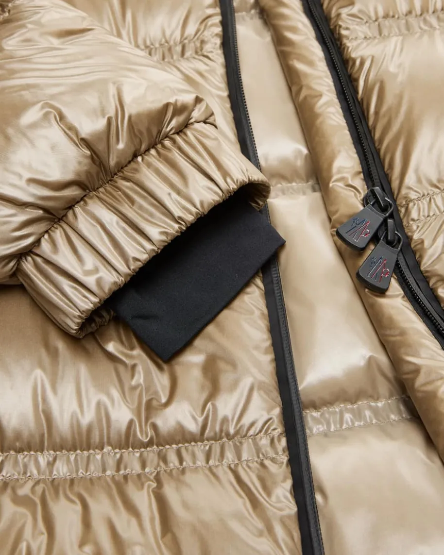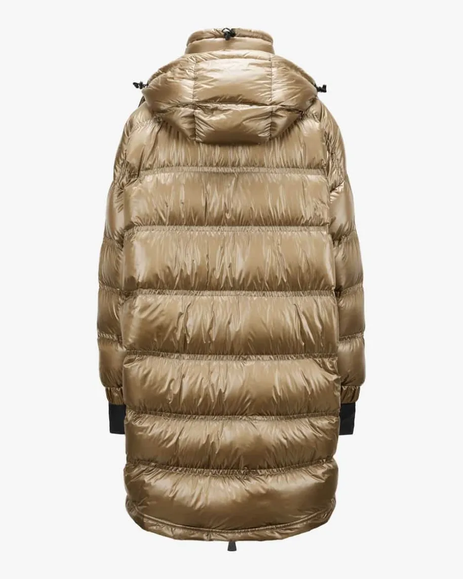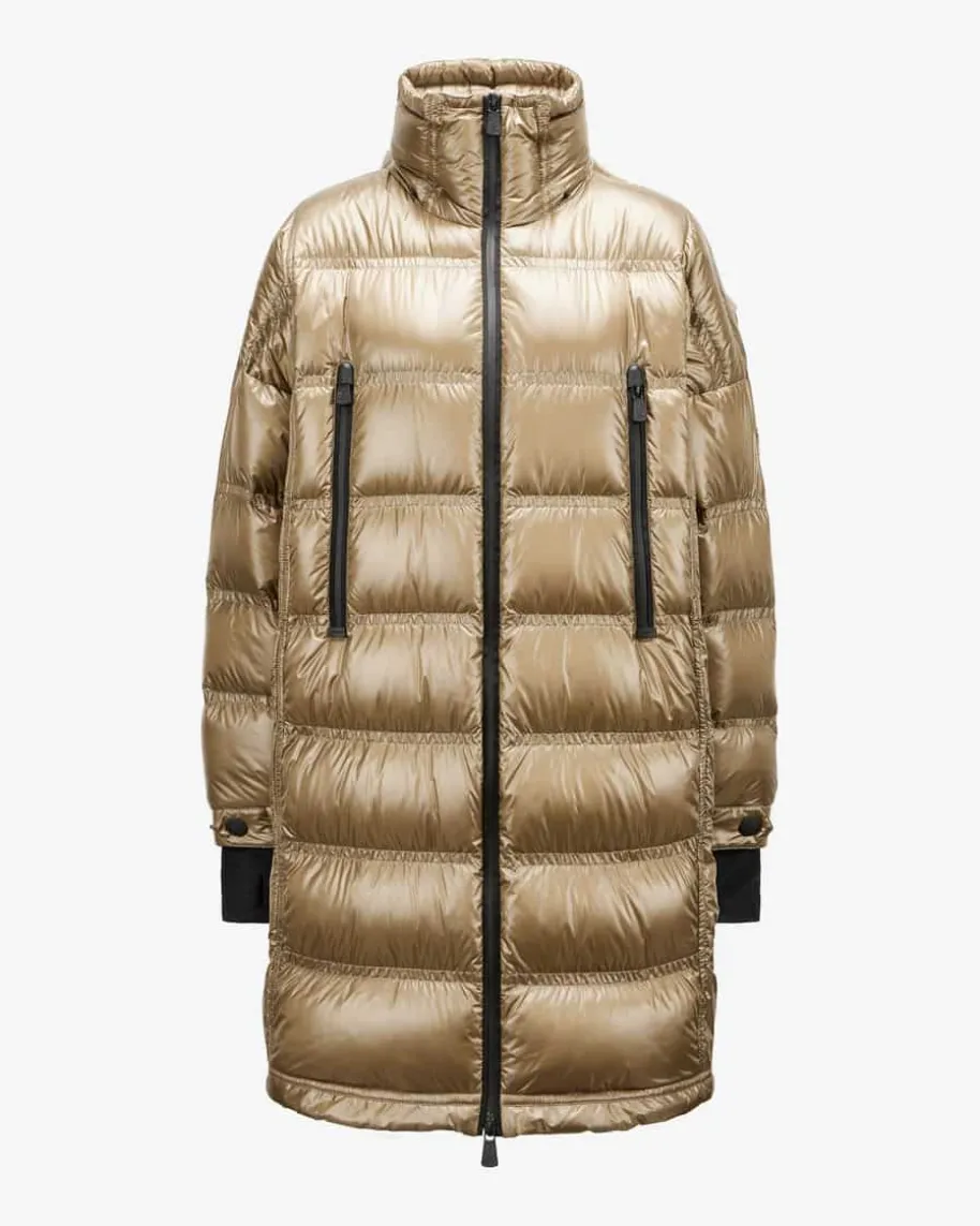 Rochelair Daunenmantel für Damen von Moncler Grenoble in Gold. Das Oversize-Modell überzeugt dank des Lackoptik-Steppmusters und der besonders leichtenDaunen-Feder-Füllung mit erstklassiger Wärmeisolierung. Zusammen mit diversenpraktischen Details punktet der Mantel zudem mit wasserabweisender, winddichtersowie atmungsaktiver Funktion als vielseitiger Begleiter. Zugleich runden Logo-Applikationen das Gesamtbild harmonisch ab.