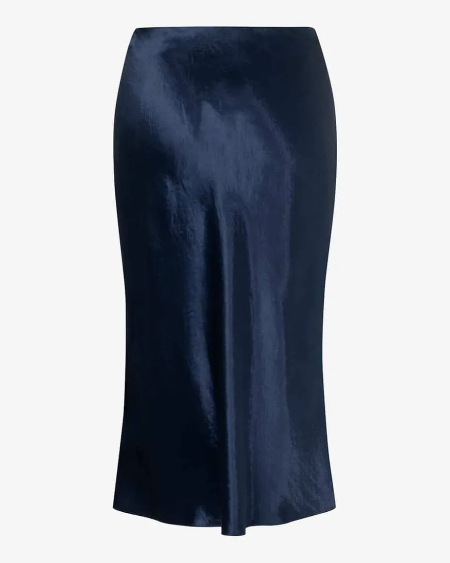 Rock für Damen von Vince in Dunkelblau. Das Modell präsentiert sich in edelchangierender Optik, während das cleane Design mit der fließenden Stoff-Qualitätgekonnt harmoniert.