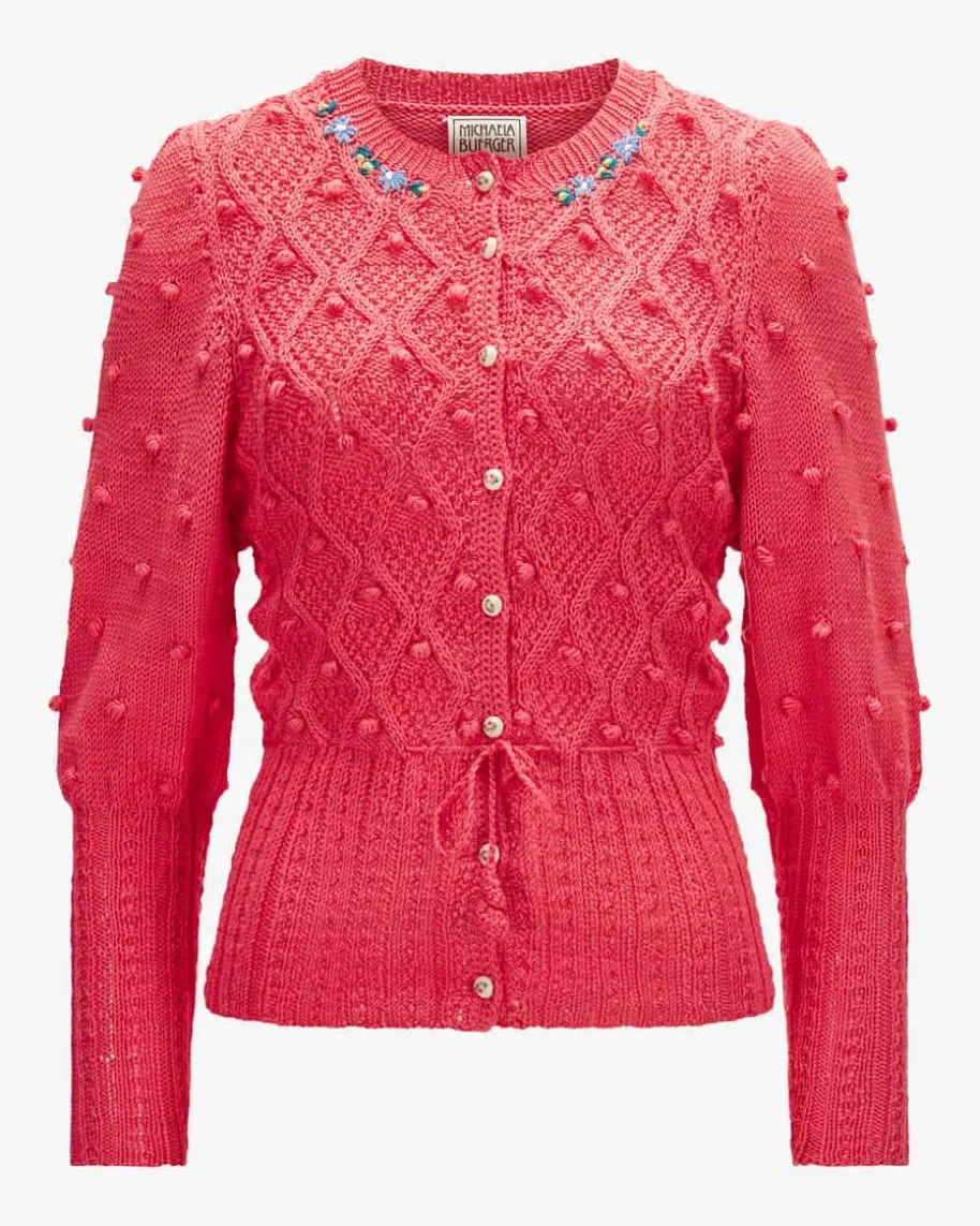 Rosalie Trachten-Strickjacke für Damen von Michaela Buerger in Koralle. Diereine Baumwolle in raffinierter Strick-Qualität punktet mit besonders angenehmemTragekomfort, während stilvolle Knöpfe sowie Kontrast-Stickereien dastraditionelle Modell gekonnt vollenden.