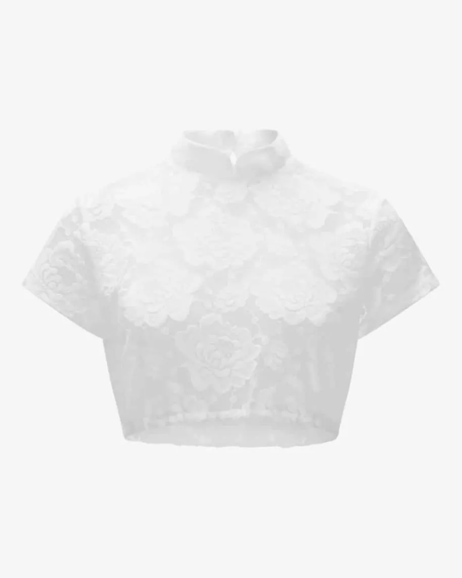 Sabrina Dirndlbluse für Damen von Susanne Spatt in Weiß. HandgearbeiteteTrachtenmode aus Salzburg – Das semitransparente Modell erhält dank der floralenSpitze eine feminine Leichtigkeit.