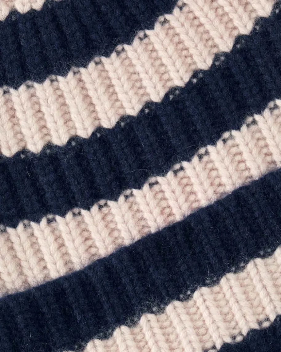 Sailor Cashmere-Mütze für Damen von Hurray Cashmere in Navy und Beige. DasModell aus hochwertiger Cashmere-Qualität avanciert durch sein grobes Strick-Design und softes Tragegefühl zum perfekten Begleiter für den Winter, währenddie modische Farbgebung den Look harmonisch vollendet.