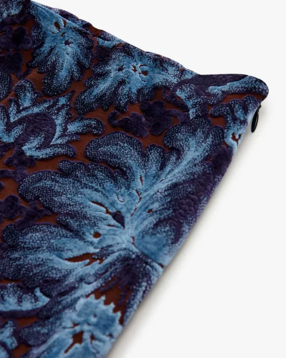Samtrock für Damen von Etro in Navy, Blau und Bordeaux. Das Modell präsentiertsich dank der schmalen Schnittführung als femininer Favorit, während der weicheAusbrenner-Samt mit edlem Ornament-Muster optische sowie haptische Highlightssetzt. Die Stretch-Verarbeitung garantiert angenehmen Tragekomfort und rundetden luxuriösen Style im Dark Romance Look gekonnt ab.