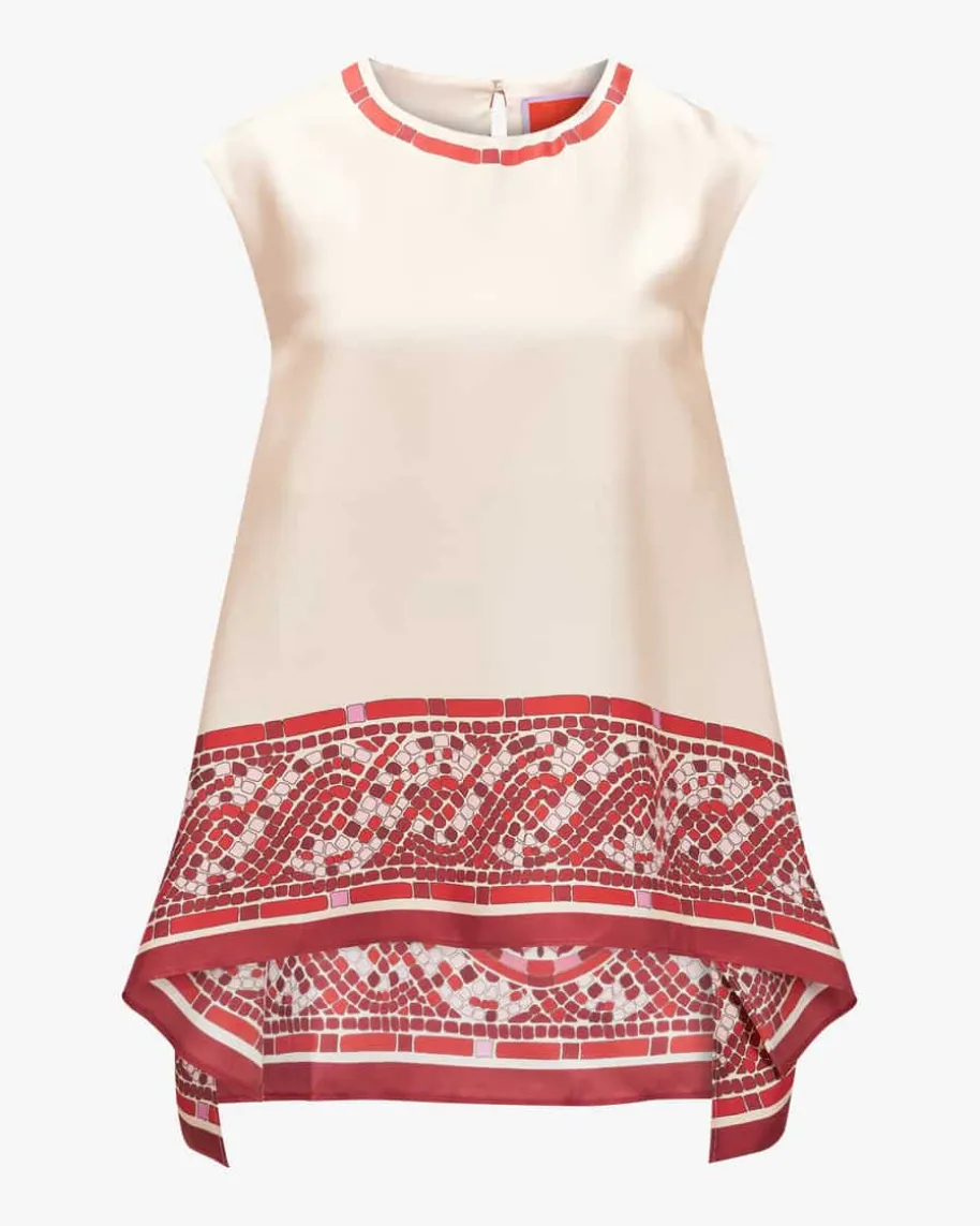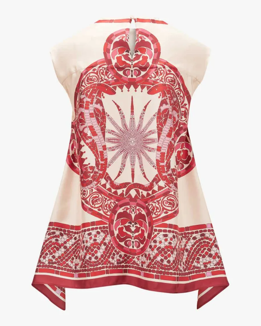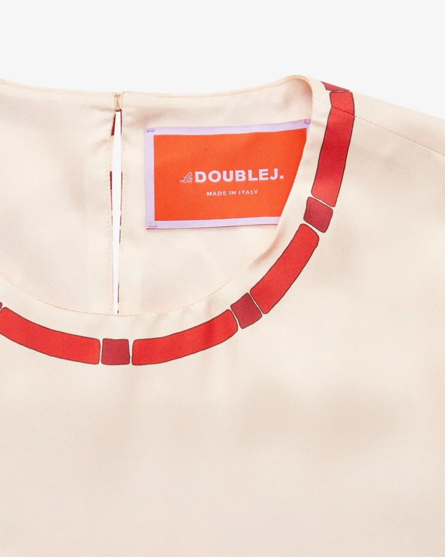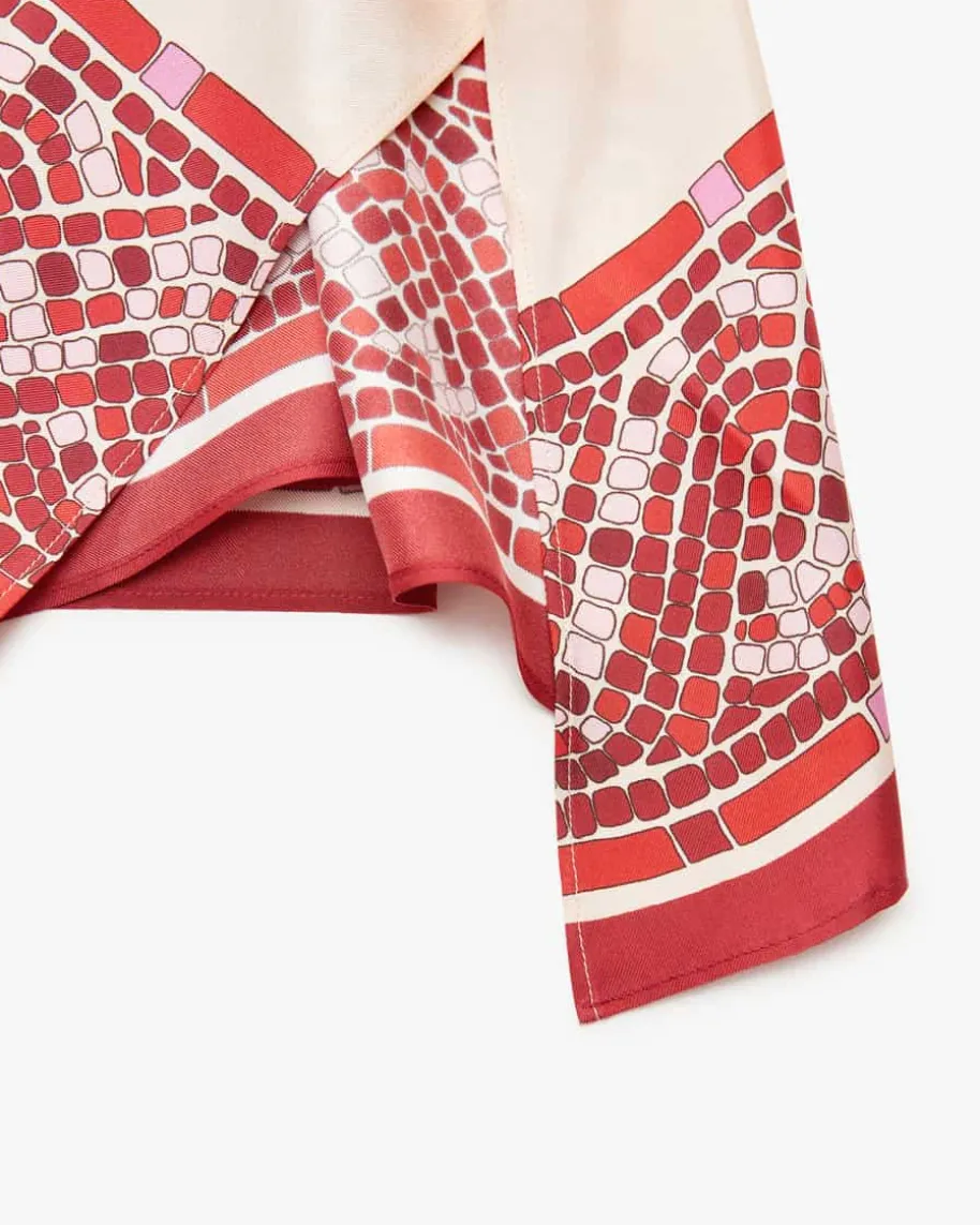 San Carlo Seidenblusentop für Damen von La DoubleJ in Rot, Creme und Rosa. DasModell begeistert mit extravagantem Foulard-Look und kreativem Mosaik-Print aufluxuriöser Seide. Die weite Oversize-Passform mit Schlüsselloch-Detail rundetden modischen Sommer-Style harmonisch ab.