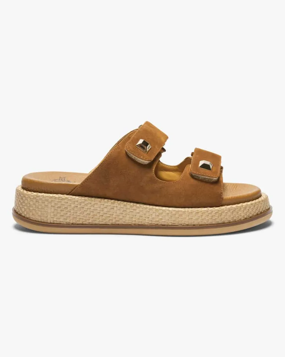 Sandalen für Damen von Truman’s in Cognac und Natur. Der zeitlose Klassiker neuinterpretiert – Das sommerliche Modell erhält dank der hochwertigenVeloursleder-Qualität sowie der Bast-Plateausohle einen modischen Charakter,wobei die Nieten-Applikationen den letzten Schliff verleihen.