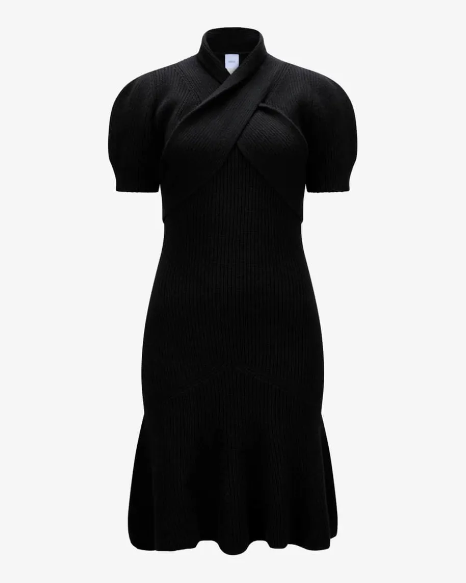 Scarf Drapped Strickkleid für Damen von Patou in Schwarz. Für besondereWohlfühl-Momente sorgt das Modell aus weichem Merinowolle-Cashmere-Mix mitmarkantem Perlfang-Strickmuster. Die schmale Passform in Kombination mit demausgestellten Rock und raffiniertem überkreuztem Schalkragen betont die Tailleund zaubert eine feminine Silhouette.
