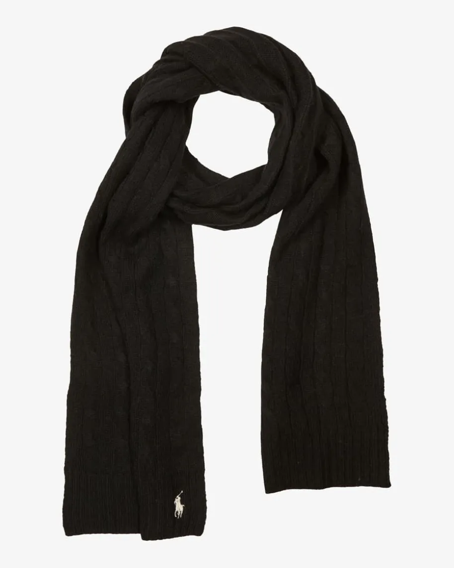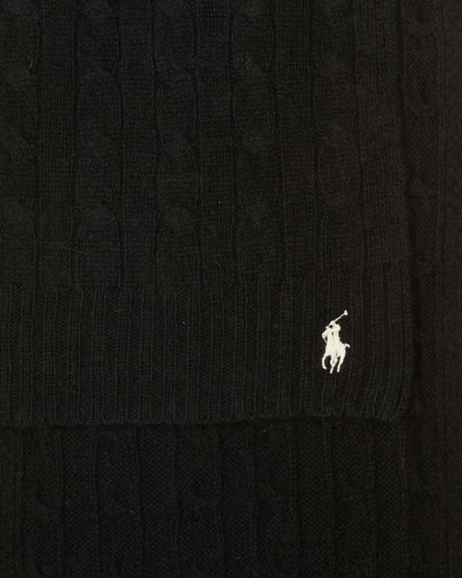Strickschal für Damen von Polo Ralph Lauren in Schwarz. Das Modell präsentiertsich dank des hochwertigen Woll-Cashmere-Mix als weicher Favorit mit angenehm-leichtem Griff, während das Zopf-Design sowie Rippstrick-Details dem Gesamtbildeinen klassisch-modernen Charakter verleihen.