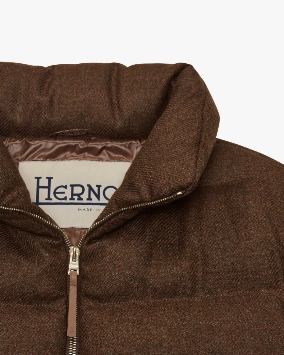 Schurwoll-Seiden-Daunenjacke für Damen von Herno in Kastanie. Die italienischeMarke kombiniert Funktionalität mit Luxus – insbesondere im Bereich hochwertigerJacken und Mäntel. Auch dieses Modell punktet als Favorit an kühlen Tagen dankder hochwertigen Daunen-Feder-Füllung, während die stilvoll melierte Optik unddie Kalbsleder-Details das Gesamtbild mit dezenten Country-Vibes abrunden.