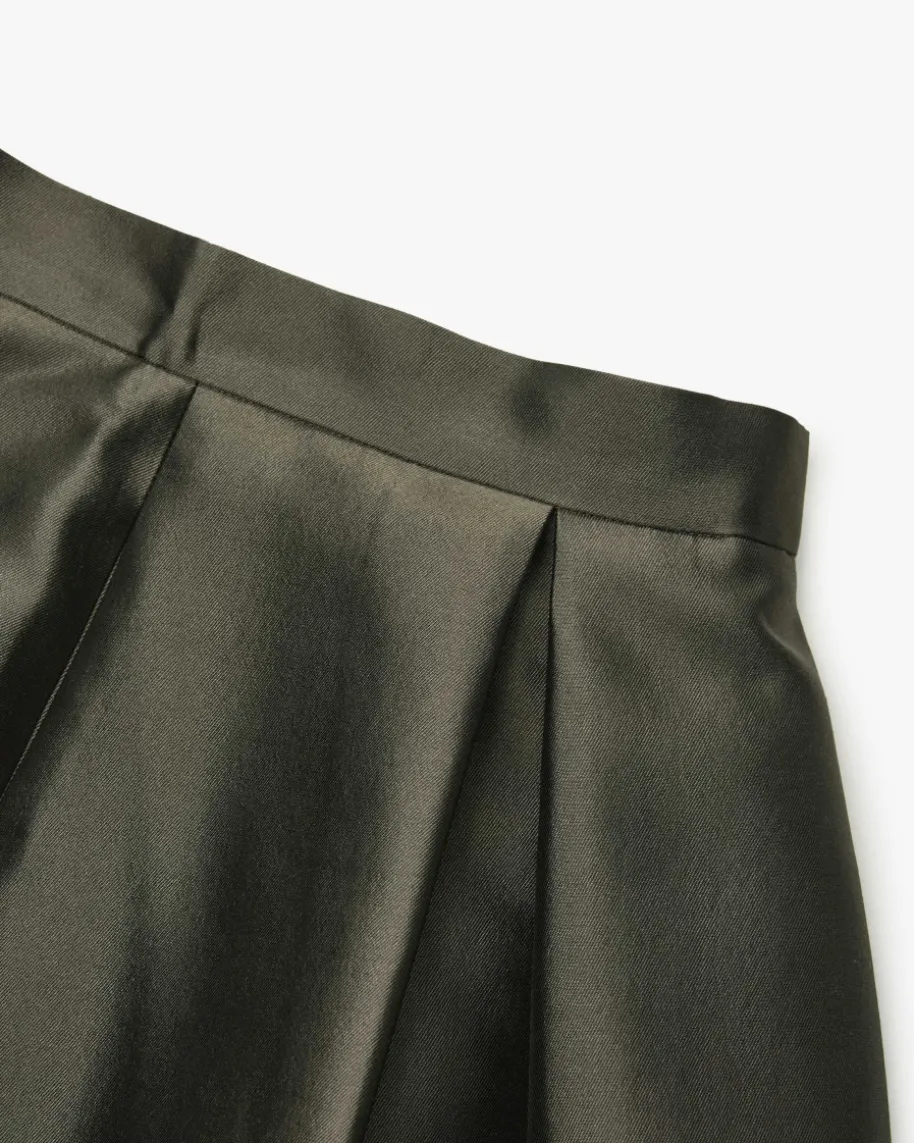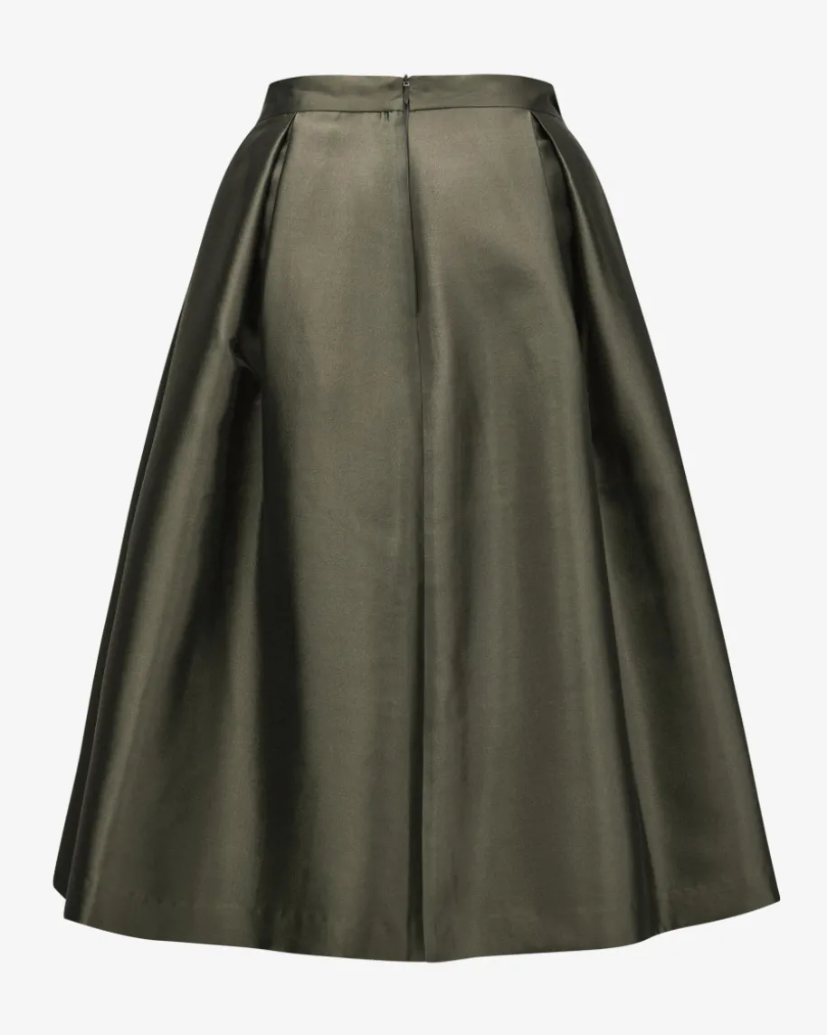 Seiden-Wollrock für Damen von The Loom in Dunkeloliv. Das ausgestellte Modellpunktet dank der hochwertigen Verarbeitung aus Seide und Wolle in edlerAufmachung, während die Falten-Details den modischen sowie femininen Lookbetonen.