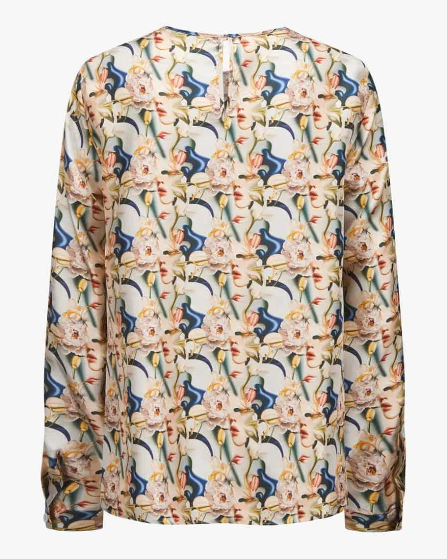 Seidenbluse für Damen von Odeeh in Bunt. Dank der fließenden Seiden-Qualitätpunktet das leicht ausgestellte Modell mit einer angenehmen, luxuriösen Haptik,während der surrealistische Print einen stilvollen Hingucker-Look kreiert.