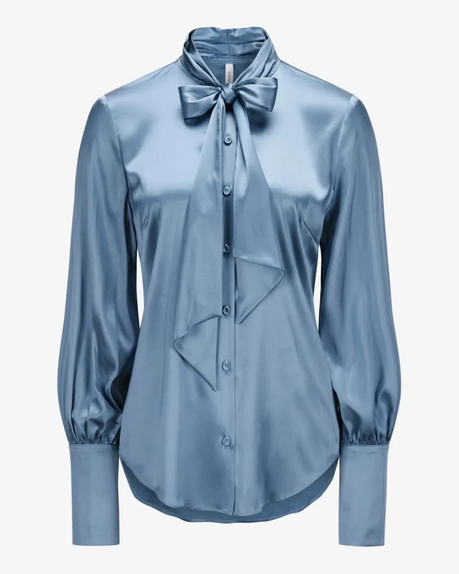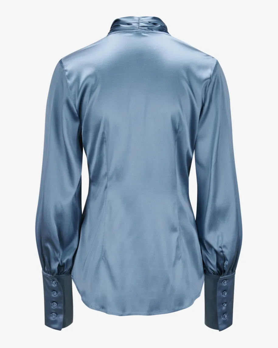 Seidenbluse für Damen von LODENFREY München 1842 in Blaugrau. JahrelangeErfahrung, hochwertige Verarbeitung und viel Liebe zum Detail zeichnen dieexklusiven Kreationen aus unserem Hause aus. Auch dieses Modell überzeugt dankhochwertiger Seiden-Qualität in fließender Haptik und angenehmen Tragemomenten,während das Schluppen-Detail einen femininen Touch verleiht.